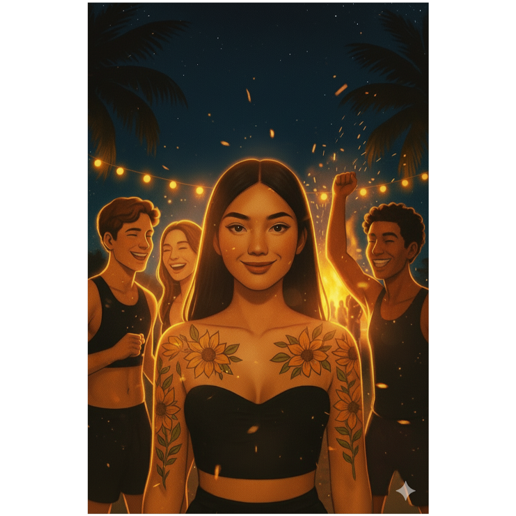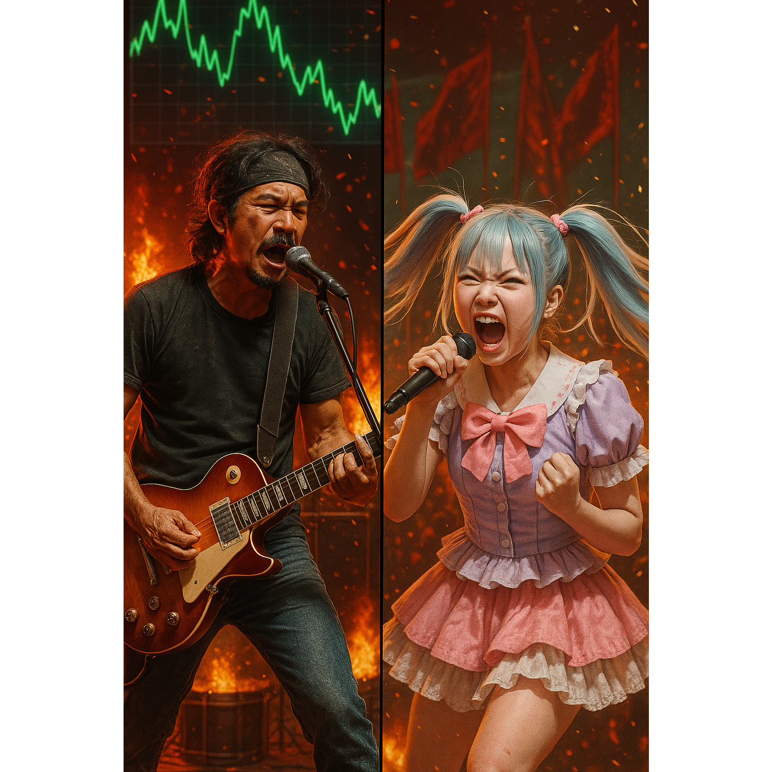 The track opens with pounding war drums and a driving electric guitar riff, Verses alternate between Thai rock flavors with folk-tinged riffs, clean yet gritty male vocals, and storytelling cadence, then plunge into heavy grunge metal with distorted guitars and growling intensity, The choruses burst into kawaii female vocals, sharp with cute-aggressive growls and J-pop brightness, clashing sweet against heavy, A halftime bridge slams with thunderous drums and gang chant vocals, igniting the break, The guitar solo blazes with a minor riff echoing the main melodic hook, The finale erupts in double-time — full band, crowd vocals, roaring guitars and kawaii-pop shrieks uniting for a massive, anthemic finish that fuses Thai rock spirit, metal power, and idol ferocity