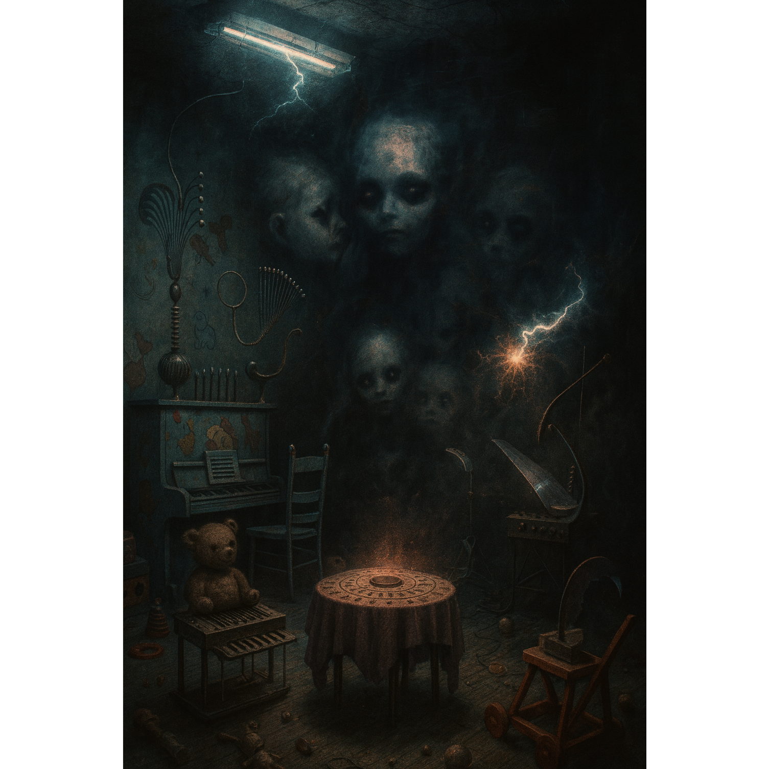 A minimalist ambient horror with sparse, echoing piano and metallic clatters drowned in icy reverb as ghostly synth pads drift through silence, looped breaths and dissonant strings slipping in and out, holding a chilling occult hush until the veil tears and an unholy orchestra of the bizarre and beautiful surges: Theremin spirits wail, Yaybahar strings shimmer like haunted steel while Zeusaphone arcs scream in lightning bursts, Ondes Martenot duels Waterphone in ghost tones, Aquaphone trembles and a Singing Saw bends reality, Sharpsichord ticks a waltz gone rogue, Subharmonicon pulses in broken symmetry, Apprehension Engine scrapes beneath the Pyrophone’s flaming tones, Glass Harmonica chimes fracture into Crystallophone shatters, Marble Machine sputters grooves, Nyckelharpa moans lament, and detuned dulcimer loops stutter backwards into warped harp reversals, surreal, not music, alchemical séance of forgotten circuits before silence returns, tuned to F Phrygian