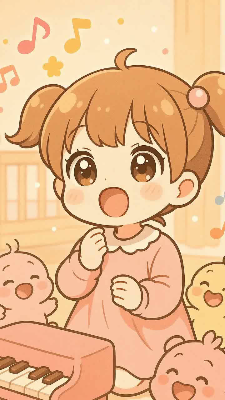 The track opens with cooing vocals, baby laughs, and playful toy piano, Gentle humming blends into delicate giggles and airy lullaby echoes, Toy percussion and rattle shakes bounce over pastel synth pads, Kawaii J-pop vocals and a breathy female lead float atop pastel toy synths, shimmering with high-pitched sweetness, Throughout, the arrangement sparkles with toybox effects, bubblegum beats, and giggle ad-libs, keeping every transition light, cute, and irresistibly endearing