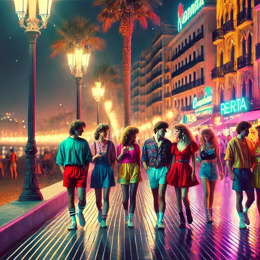 1980s, Italo Disco, synth pop, fast tempo, major key, dominant synth leads, drum machine with claps, electronic effects, clear melodic vocals, layered structure, 80s reverb, nightlife theme, bright