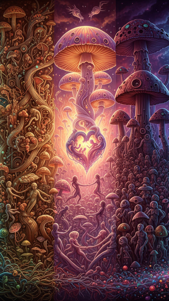 The Ten Commandments of Mycolypse [Improve, Overcome, Dominate, Takeover, Adapt, Survive, Harvest, Love, War, Forgiveness], delivered by the Fungal Monarch as a dark, transformative world takeover, Maximalist Fungi Industrial Dance-like, Pure Dark Techno-inspired, Grinding EBM-like, Cinematic Breakdown-like, Toxic, Invasive, Rhythmic Domination, All previous Mycolypse dark instrumentation [Industrial Drums, Distorted Bass, Acidic Synths, Toxic Noise], Divine, Aggressive, Relentless Rhythmic, and Transcendentally Dark, Over 10 distinct, slimy, gooey, liquid sounds (no English) that create rhythmic cues