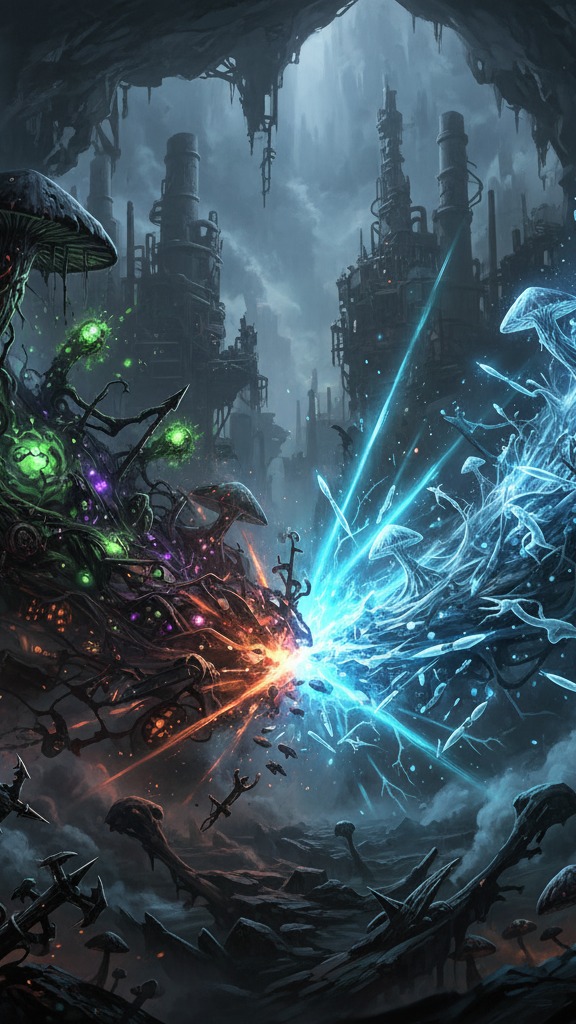 Instrumental Epic, TOXIC FUNGI EBM-like, Dark Techno War Anthem-inspired, Irresistibly Danceable, Rhythmic Industrial Dance-like, Maximalist, Driven by a relentless, distorted EBM kick drum and hyper-aggressive, acidic basslines, Features metallic, sharp industrial percussion and minimal, cold synth pads, The rhythm track must be overwhelmingly powerful and complex, The core feature is the fusion and battle between the two "vocal" tracks, Integrates over 10 distinct liquid, slimy, and gooey fungal sound effects [Biodata Sonification] that serve as the primary dynamic cues and rhythmic drivers, Utilize extreme distortion, resonant filtering, and sidechain compression to create a crushing, invasive groove, The final production must sound vast, binaural, and toxically irresistible, NO ENGLISH, Consists only of highly-processed, slimy, oozing, and liquid utterances that aggressively dictate the beat, serving as the rhythmic core, INCOHERENT VOCAL SAMPLE