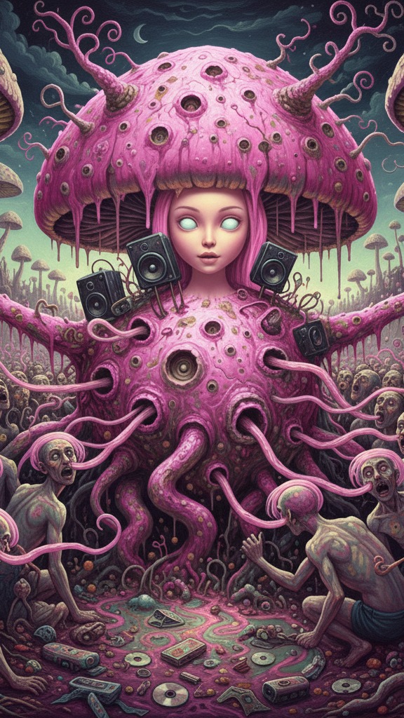 Instrumental Epic, TOXIC FUNGI EBM-like, Dark Techno War Anthem-inspired, Irresistibly Danceable, Rhythmic Industrial Dance-like, Maximalist, Driven by a relentless, distorted EBM kick drum and hyper-aggressive, acidic basslines, Features metallic, sharp industrial percussion and minimal, cold synth pads, The rhythm track must be overwhelmingly powerful and complex, The core feature is the fusion and battle between the two "vocal" tracks, Integrates over 10 distinct liquid, slimy, and gooey fungal sound effects [Biodata Sonification] that serve as the primary dynamic cues and rhythmic drivers, Utilize extreme distortion, resonant filtering, and sidechain compression to create a crushing, invasive groove, The final production must sound vast, binaural, and toxically irresistible, NO ENGLISH, Consists only of highly-processed, slimy, oozing, and liquid utterances that aggressively dictate the beat, serving as the rhythmic core, INCOHERENT VOCAL SAMPLE, A continuous loop of a beautiful, wordl