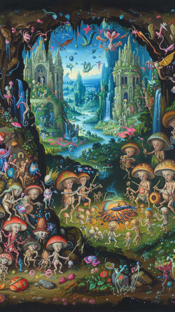 Instrumental Epic, Maximalist Fungi Industrial Dance-like, Dark Techno-inspired, EBM-like, Organic Noise-like, Transcendent, Features relentless, heavy industrial percussion (distorted kick drums, sharp metallic clangs, complex rhythmic layers), Melodic and atmospheric elements are driven by gritty digital synthesizers, vast dark techno pads, and a prominent, squelching sub-bass, All melodic textures must feel electronic and synthesized, removing any acoustic or orchestral instrumentation, Focus on integrating gooey, wet, squelching, popping, and clicking sound effects [mycological and molecular movement] into the percussive and rhythmic layers, Utilize extreme filter sweeps, distortion, and phasing to enhance the chaotic, organic movement, Dynamic control of tempo, tonality, and sound supremacy must be highly pronounced, following the abstract vocal cues, The overall tone must be driven, dark, rhythmic, and ultimately affirming, The "vocal track" uses processed, distorted, echoing