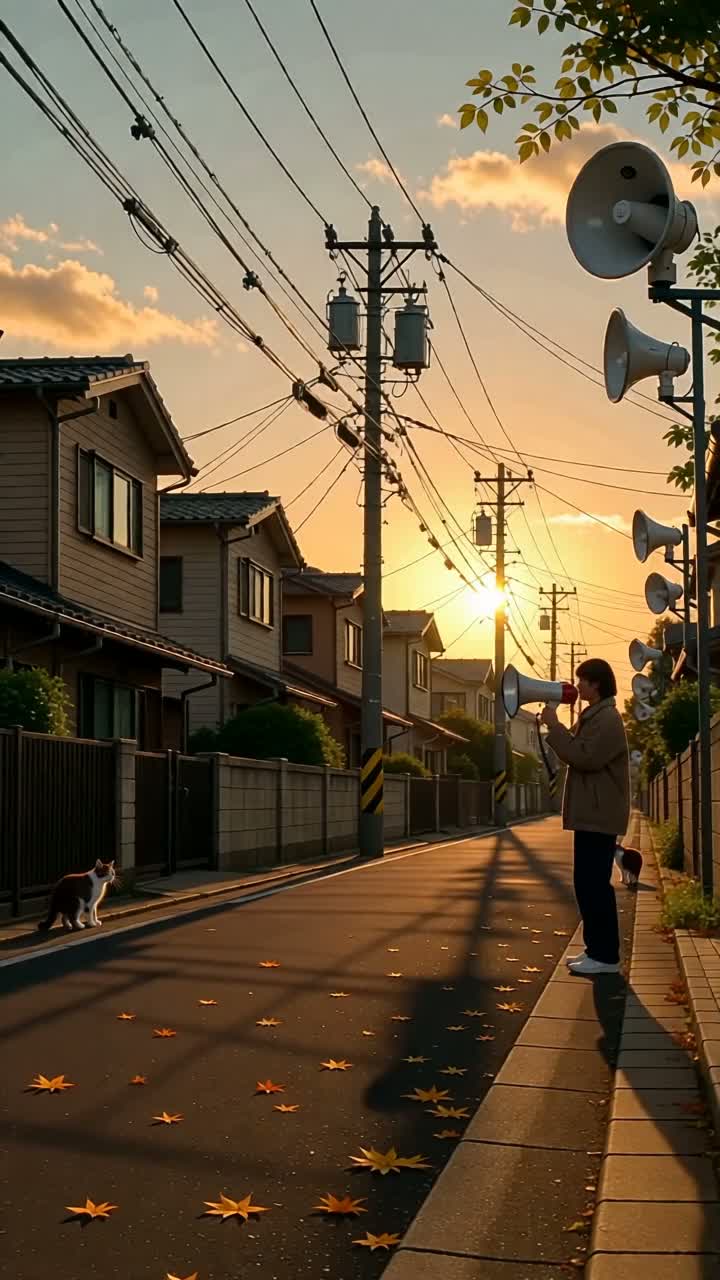 A surreal Japanese town broadcast that sounds as if it's being played through a public loudspeaker or megaphone, The voice is calm, polite, and slightly distorted by the PA system, echoing through a small town, Behind the announcement, a lively melodic rock backing track plays with electric guitar, bass, and drums, The mix feels unreasonably epic and ironic — as if a local neighborhood announcement accidentally turned into a rock concert, Include slight outdoor ambience (distant wind, birds, street noise), but keep the voice as the main focus, rock, japanese, public broadcast, humorous, surreal, nostalgic, loudspeaker, melodic, ironic