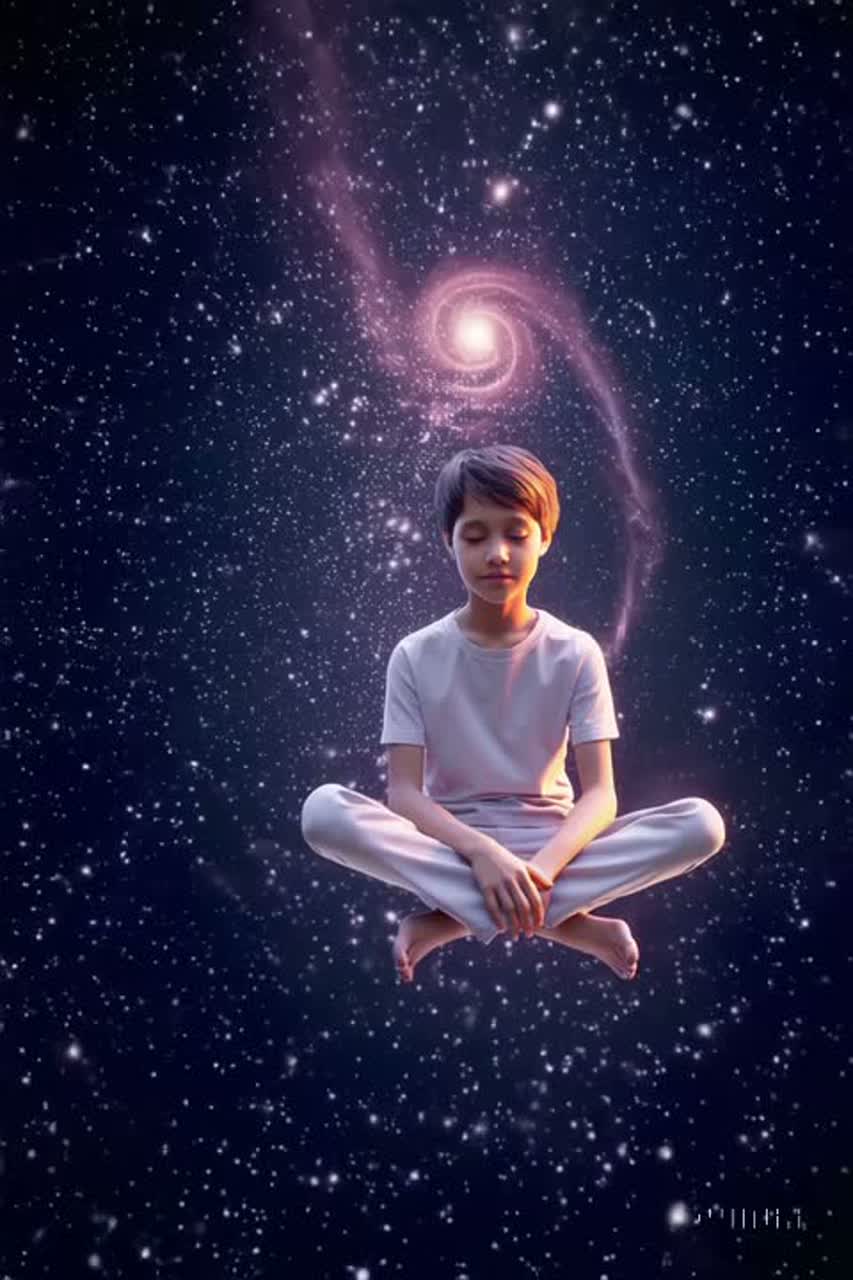 Bangla rock, Minor, 158BPM, spoken child voice(age around 10, soft and gentle tone) speaking calmly and thoughtfully without any singing, quiet meditative narration as if lost in deep kuu, tabla and sitar breathing subtle rhythmic patterns, sarod softly echoing like a fading thought, tanpura drone resonating through cosmic stillness, occasional temple bells shining faintly, realistic outer space ambiance filled with silence and starlight, serene and spiritual atmosphere where a child quietly contemplates the universe