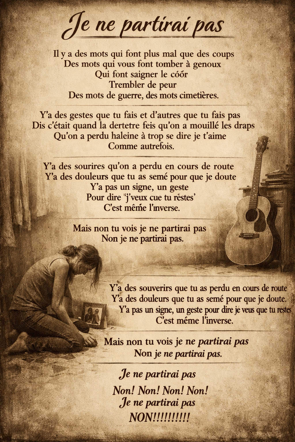 Un chant de marins démarre avec de profondes voix masculines, rythmées par percussions légères imitant des pas sur le pont, Les couplets alternent spoken word poétique et chœurs a capella, soutenus par accordéon, basse, et cris lointains évoquant la mer et le vent