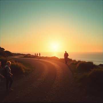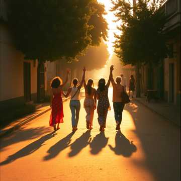 Gentle emotional pop with female vocal group harmonies, soft acoustic guitar, piano, light strings, subtle hand percussion, tempo 82 bpm, key G major, Viral uplifting chorus designed for sing-along, Layered female harmonies building each chorus, Warm atmospheric mix, cinematic but intimate, Inspired by modern folk-pop, Choir-style harmonies in final chorus, Feeling of sunrise at Finisterre and friendship