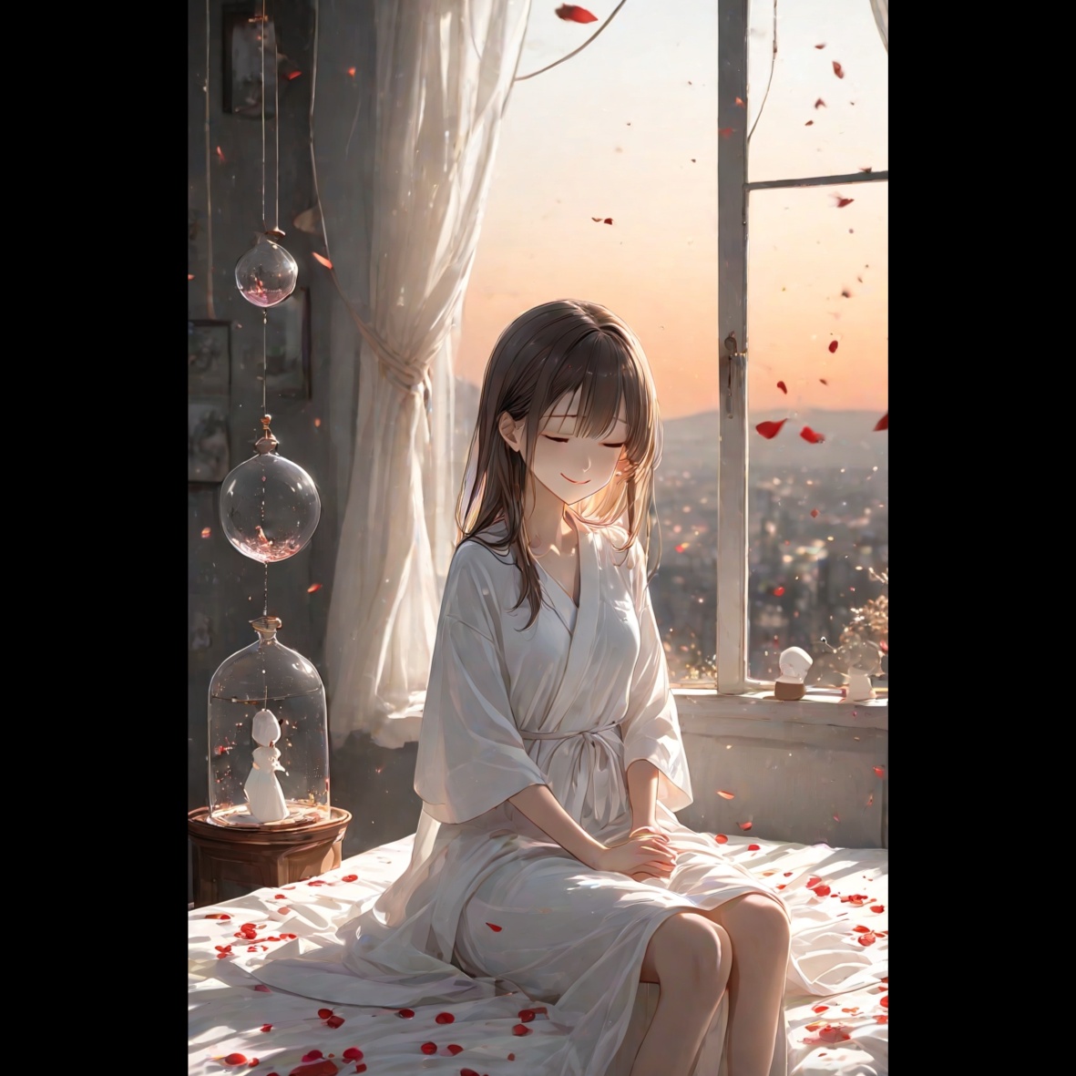 A cinematic and emotional Japanese ballad with soft piano, soft strings, and delicate ambient textures, The slow tempo of around 70 BPM evokes beauty, transience, and hope amidst sadness, The song is full of emotional ups and downs, building to a soft yet powerful climax in the final chorus, Delicate harp touches and reverb-infused ambient layers are interwoven, Instrumental only, A Japanese female vocalist with a soft, emotional, and crystal-clear tone, A sincere, melancholic, yet hopeful atmosphere is required, Natural vibrato and breathy textures are recommended, Delicate phrasing is required, especially in the chorus, to express inner strength and vulnerability