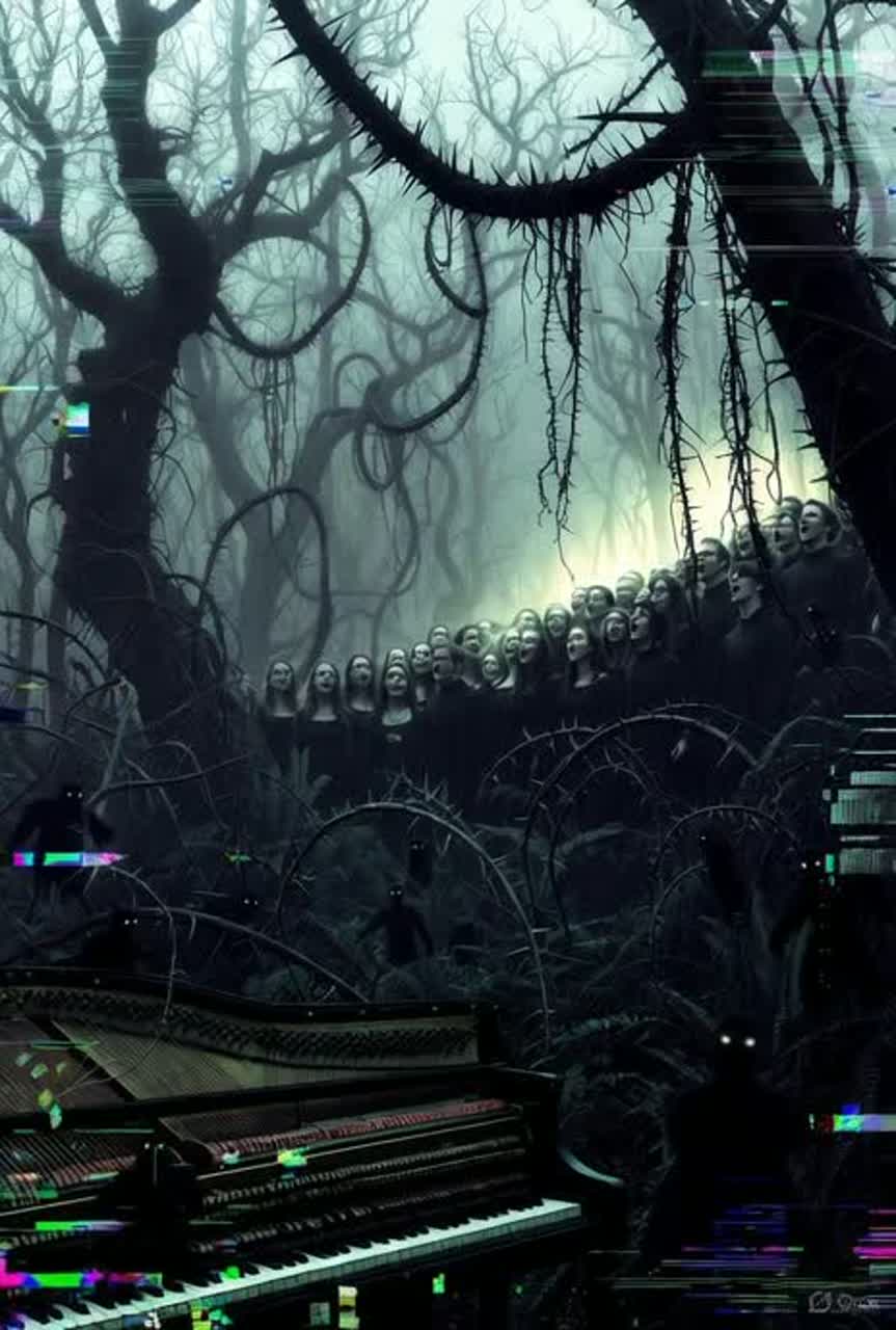 Epic Symphonic Trap, Hardcore, atlanta Rap, Black Metal drum work, Oriental Metal, Djent, R&B, Dark, Epic, Dark technical R&B, Full technical jazz, full Latin choir, urban vaporwave, urban trap, dark underground, dark rap, rapping, tragedy, acoustic soloes, dance pop style mashup song, Music: building-tempo, syncopated pulses, dynamic shifts from chaotic highs to tense emotional lulls, builds with jagged synths and with reverb layers, ending in eerie echoing silence, Vocals: countertenor, full choir, male, syncopated, gruff, old