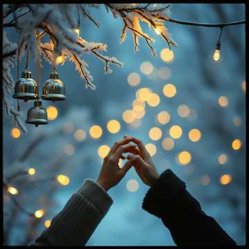 traditional pop song with a traditional christmas vibe with silver bells, dream pop groove, male and female vocals, warm, funk, pop, and cascading silver chimes in the background giving a dreamy euphoric warm glow, lo-fi, swing, jazz, piano jazz, easy listening, dream pop