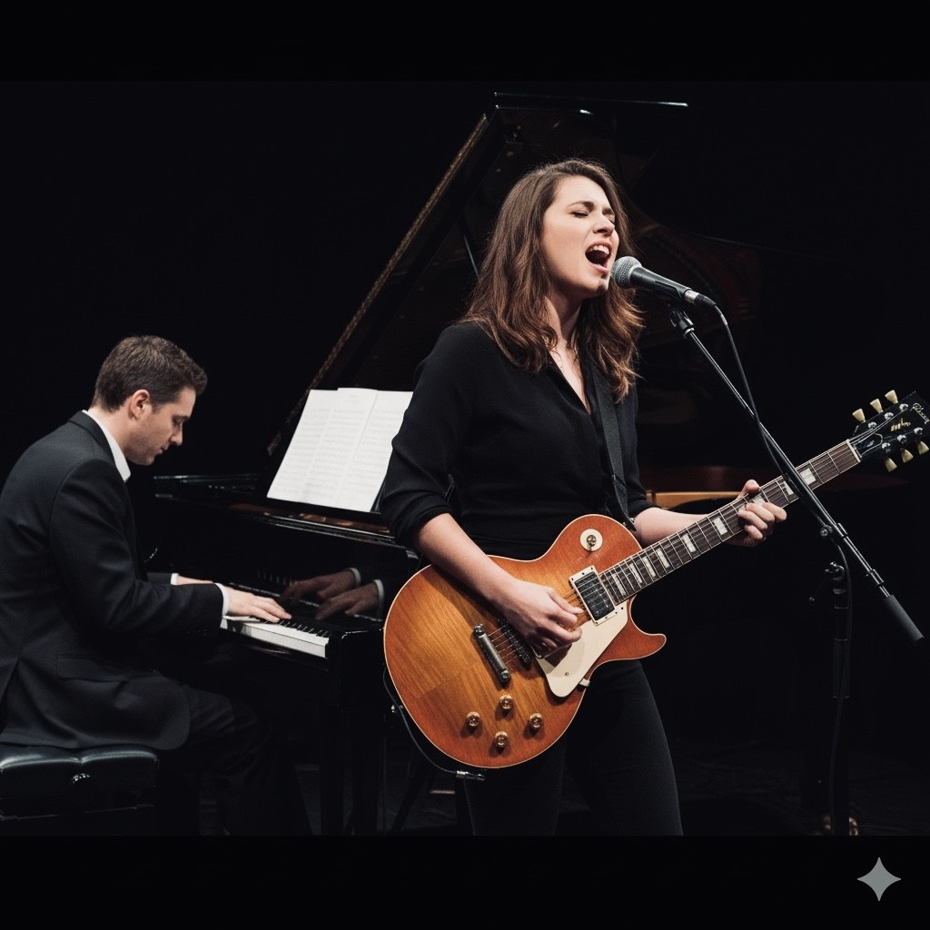 Britpop-inspired emotional storytelling song, No intro — the vocal starts immediately with gentle guitar and bass, Medium tempo with a steady, driving beat, Expressive and Cute Girl Vocal, Prominent electric and acoustic guitars, tight drums, and melodic bassline, Strings (violin, viola, cello) enter just before the chorus, adding a cinematic lift and emotional tension, Include a bluesy, crying guitar solo for the interlude, Bittersweet yet hopeful — a story of a father and his high school daughter slowly finding mutual understanding and light beyond misunderstanding