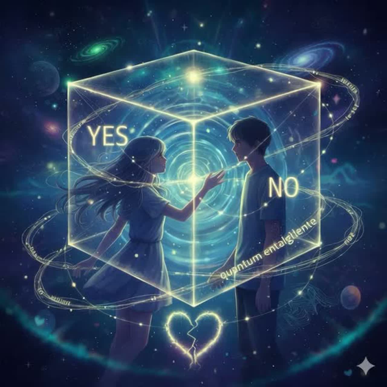 Japanese 80s-style sci-fi street rock, tempo 170 bpm, classic 8-beat 4/4, Raspy male lead vocal sings rhythmically using "Ton" and "Tsu" syllables for Morse-style parts (A/Bメロ・間奏), sings original Japanese lyrics in the choruses and Last Chorus, High-tone sexy female backing vocals for short call-and-response ad-libs (“Yeah!”, “Oh yeah!”, “Hey!”) panned right, Female voice does not sing main melody—only short ad-libs in choruses, Crunchy distorted guitars, heavy bass, pounding drums with bright snare, and raw live-club garage rock sound, Occasional retro synth stabs and beeping Morse-code-like FX in intro and bridges to emphasize sci-fi/quantum theme, Ton/Tsu syllables in Morse parts slightly shorter than regular notes for rhythmic effect, Energetic, raw, bold, slightly humorous, Ending slows into a bluesy, expressive guitar jam fading out naturally, Language: Japanese