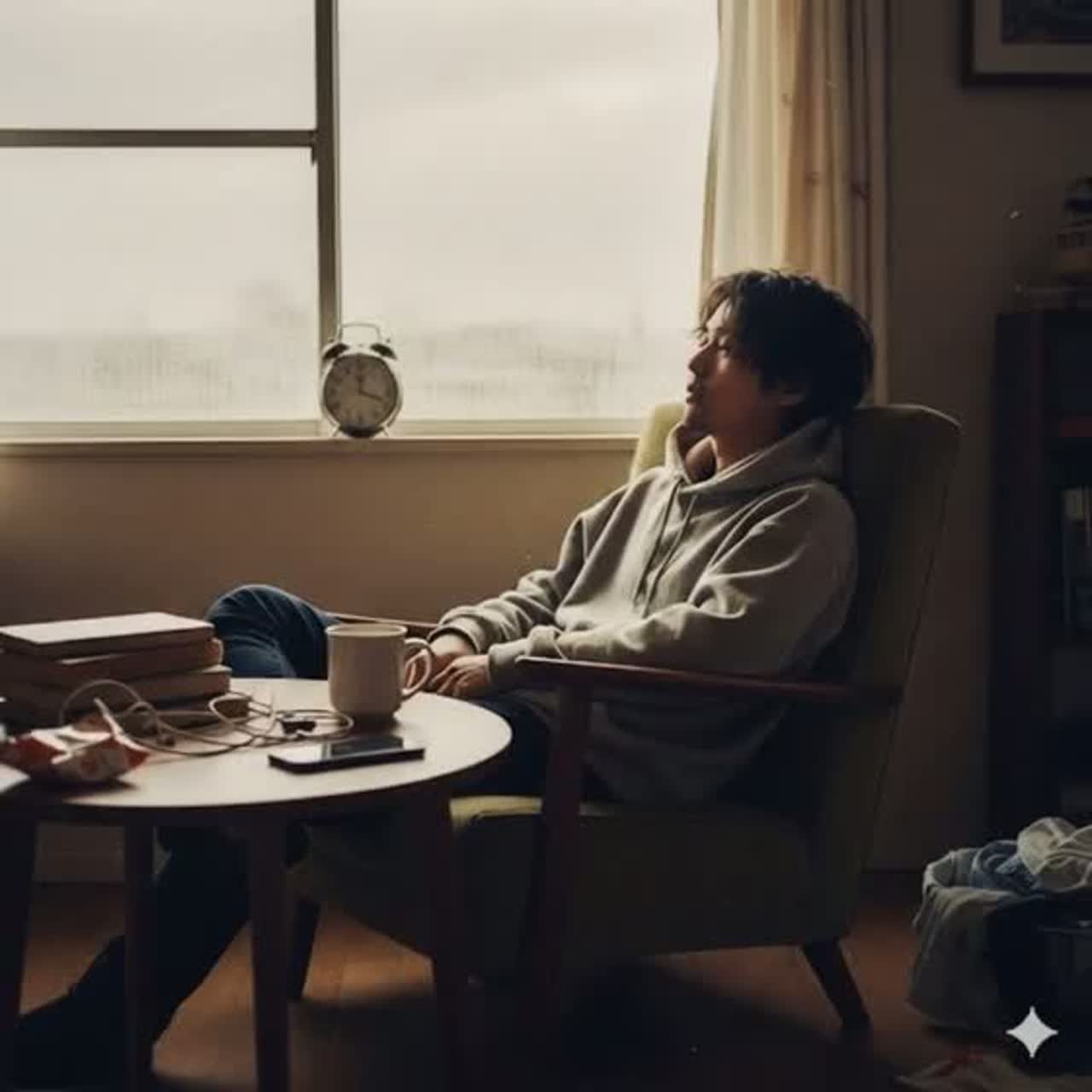 Mid-tempo Japanese rock, tempo around 100 BPM, key C or D major, dry and understated rock sound, walking pace feel, steady 8-beat drums with restrained snare and subtle hi-hat, clean electric guitars with very mild grit playing simple chord strums, no riffs, no solos, no synths, no strings, warm and supportive bass following the root notes, minimal arrangement, no big dynamics, no dramatic build-ups, vocals are male, low to mid register, natural and conversational delivery, calm and slightly tired tone, not emotional, not uplifting, not dramatic, lyrics in Japanese, short structure intro verse chorus verse final chorus outro, very tight form, avoid repeating sections if possible, focus on realism and everyday mood, lo-fi live band feeling, small room ambience, minimal reverb, end cleanly and simply without fade-out