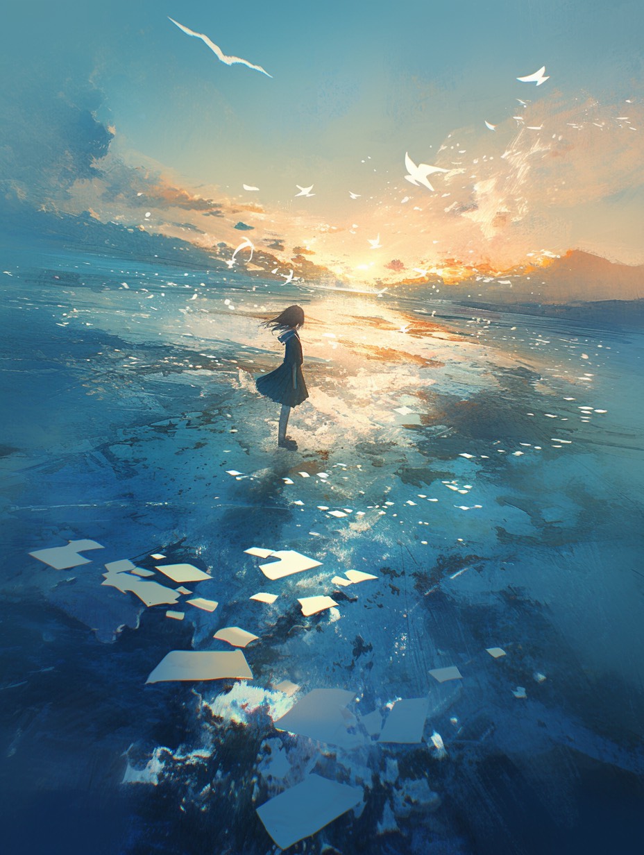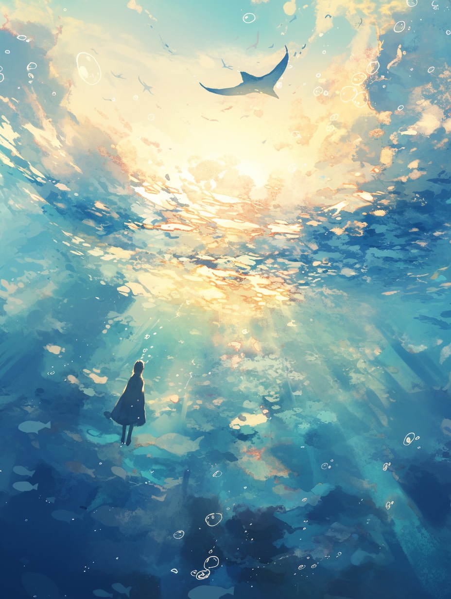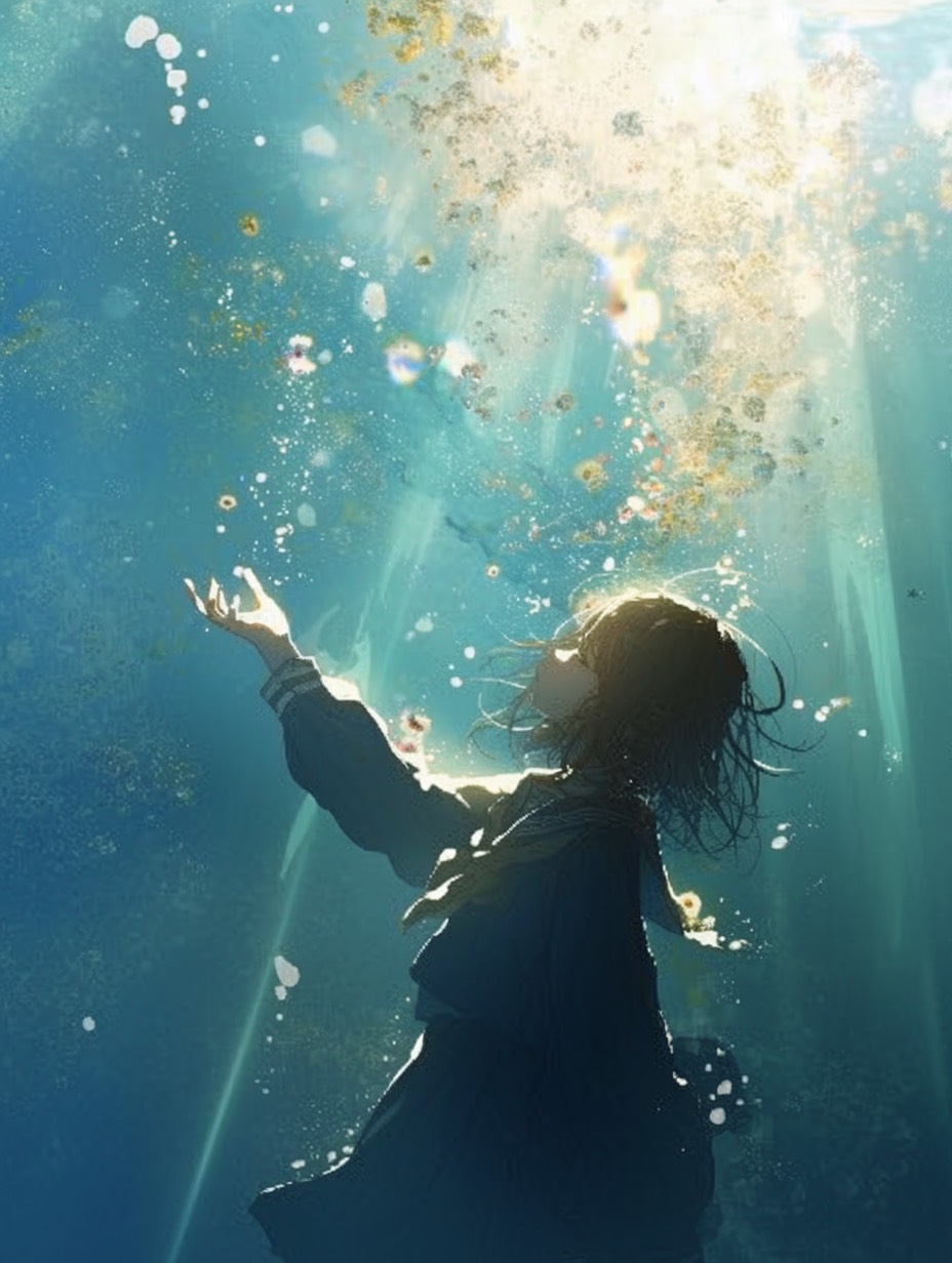 Female vocal, slightly husky and natural voice, vocaloid-like, slightly recitative pronunciation, slightly flat, electronic ambient, pleasantly understated melody and rhythm, unobtrusive realism, modern, introspective layering, submerged emotion, subtle ocean ambience, distant underwater bubbles, delicate water ripple textures, soft high-pitched synth sparkles to mimic light reflections, minimalistic floating rhythm