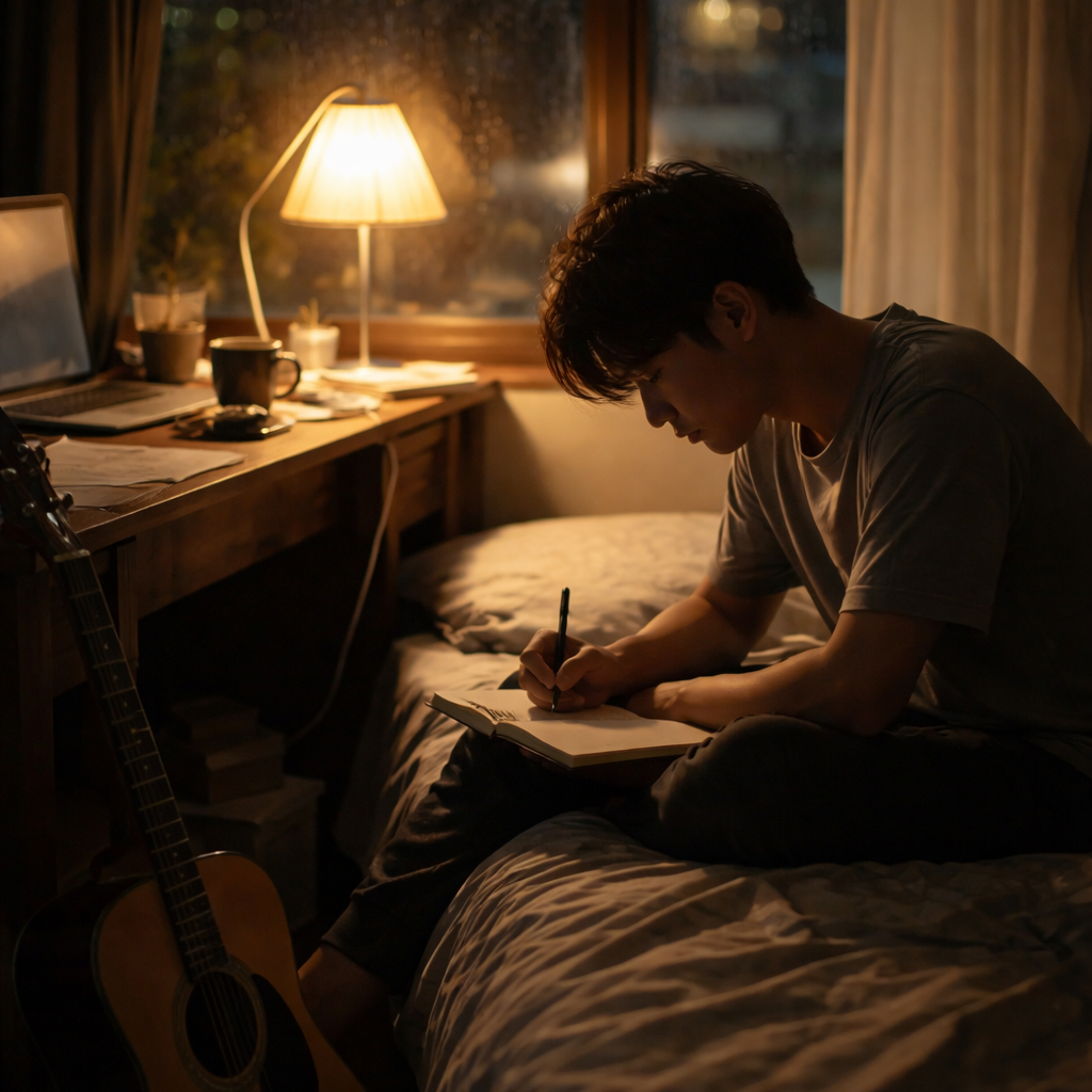Melancholic Mandarin Pop Ballad, Solo Male Vocal, Warm and Close Vocal Tone, Piano-Driven Arrangement, Gentle Acoustic Guitar Layers, Light Ambient Pads, Gradual Emotional Build, Soft Percussion (Brushes / Low-Key Kick), Mid-Slow Tempo (72–78 BPM), Cinematic but Intimate, Late-Night Reflection, Healing, Hopeful Undercurrent