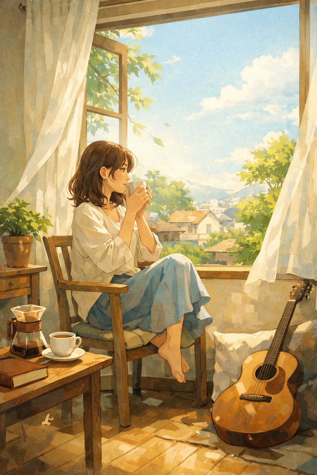 Bossa Nova, Chill Jazz Pop, soft afternoon mood, Relaxed tempo (70–85 BPM), warm and intimate atmosphere, Nylon guitar with gentle bossa rhythm, soft brushed drums, upright bass with smooth walking feel, subtle electric piano, light percussion (shaker, rim click), Female vocal, calm and airy, close-mic intimacy, slightly breathy tone, relaxed phrasing, Peaceful, cozy, nostalgic but not sad, Perfect for a quiet afternoon, sunlight through curtains, coffee, slow breathing, doing nothing without guilt