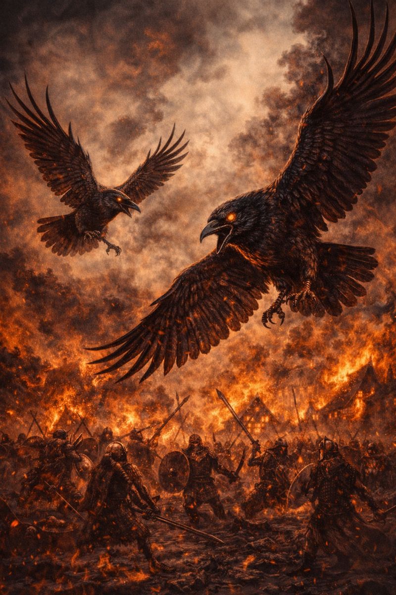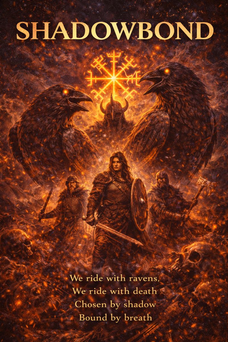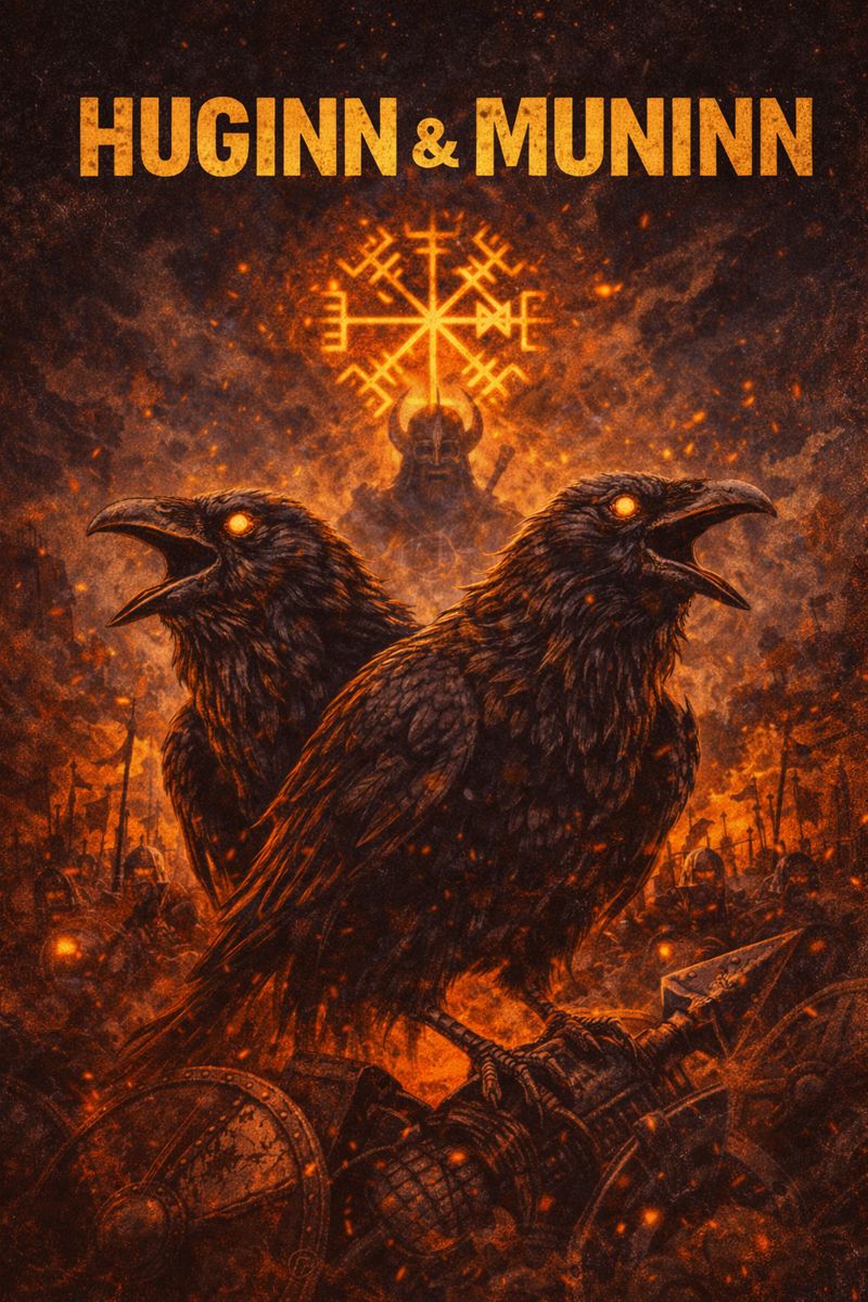 Dark Folk Electronica + Ritual Metal | 138 BPM thrash pulse with ceremonial drops | Low-tuned guitars locked to relentless thrash drumming, blast-driven momentum alternating with half-time ritual stomps | Mongolian throat singing techniques: deep kargyraa drones, overtone-rich khöömei harmonics, call-and-response with whispered chants | Electronic elements: sub-bass drones, distorted folk synths, granular wind textures, war-horn swells, analog pulse sequences | Percussion: rapid double-kick thrash patterns, taiko-style floor toms, frame drum accents, metallic strikes | Atmosphere: cold, nocturnal, myth-bound, raven-winged | Vocals: throat-sung verses, shouted male chants, spectral backing choirs | Production: wide stereo ritual space, cavern reverb, raw low-end power | Theme: Odin’s ravens as watchers, memory and thought circling the world, knowledge carried on black wings through war, time, and fate