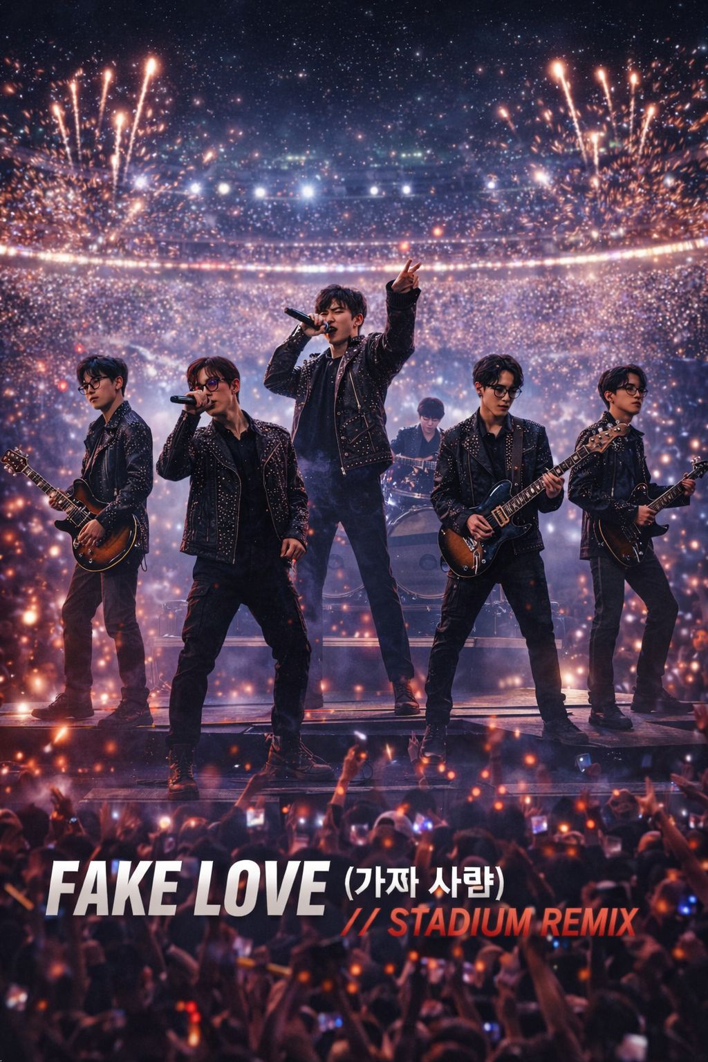 K-pop stadium remix, hip-hop + rock + EDM blend, 140 BPM, massive crowd chants, live concert atmosphere, male vocals + falsetto hook, distorted electric guitars, punchy trap drums, festival synth leads, reverb-heavy arena mix, emotional build-ups, explosive drops