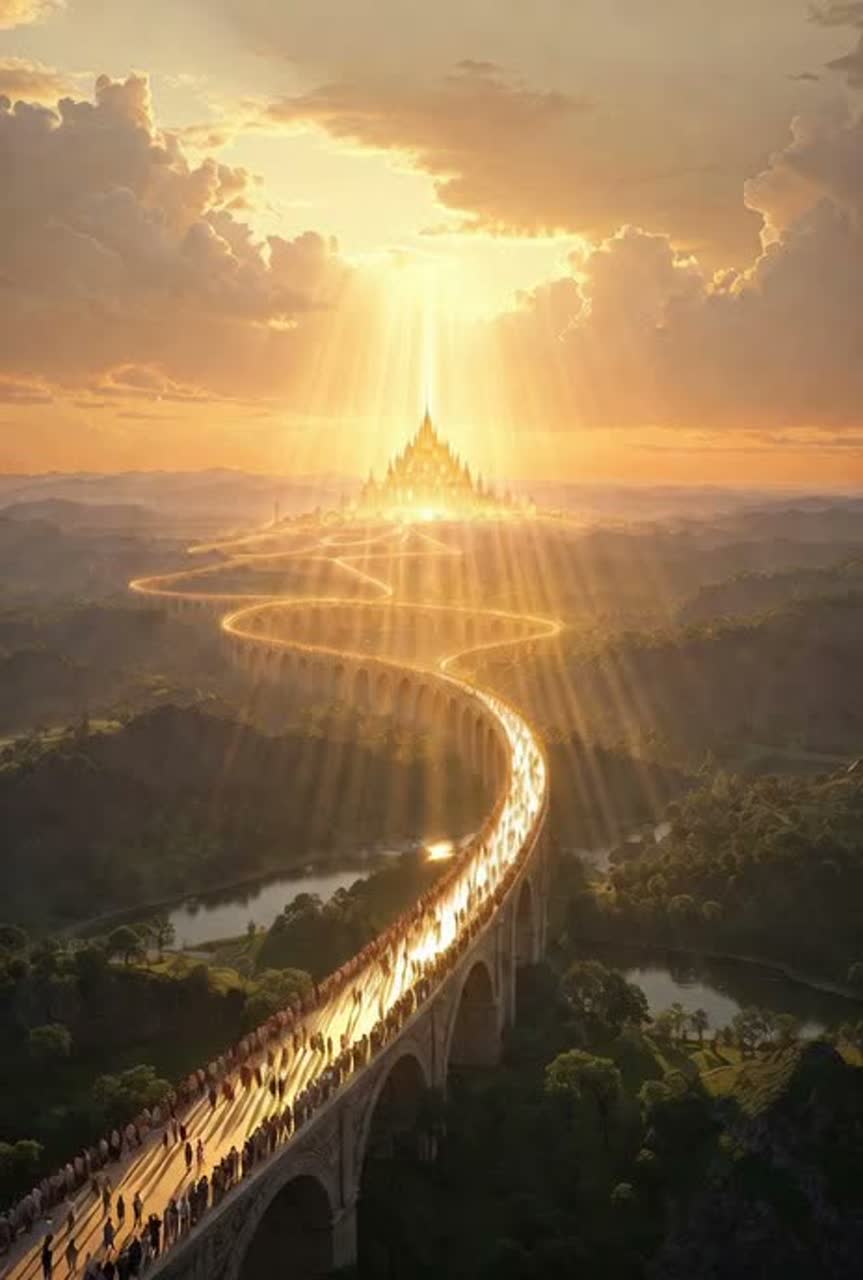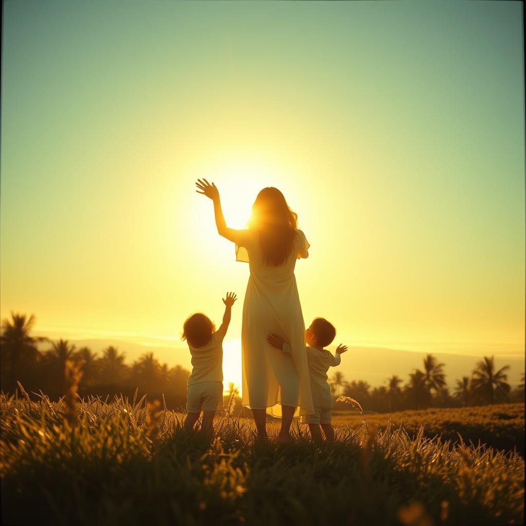Uplifting cinematic folk-pop, golden sunrise worship anthem, ethereal and warm, hopeful peaceful optimistic atmosphere, glowing acoustic guitars, bright shimmering strings, gentle piano sparkle, soft angelic choir harmonies in chorus, light percussion with soft kick and tambourine glow, dreamy reverb, radiant female lead vocals + harmonious male-female backing, cinematic build-ups, emotional uplifting crescendo, healing sunny vibe, folk-indie with orchestral warmth, 80-90 bpm, in the style of radiant morning light, eternal sunrise, pure joy and unity, lush warm production, glossy hopeful soundscape, [bright] [melodic] [warm] [ethereal] [inspiring]