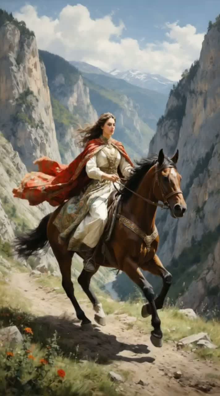 Georgian-style music, A soft intro with layered synth pads leads into crisp, syncopated drums and a pulsing bass, Verses glide with subtle guitar riffs and airy textures while the chorus bursts with bold hooks, vocal harmonies, and dynamic percussion, Bridge strips back for atmosphere, then lifts for a driving outro, Epic Georgian ballad, epic about Queen Tamara, wind folk instruments of the east, Grisian melodies and Chest drawl low voice ripples, dombra solos, acoustic guitars, oriental coloring of music, clear sound like an echo in the mountains, low deep and soulful voices, choir Georgian polyphony, music like fresh air, the vastness and flow of the river, the flight of an eagle, The rhythm of the music emphasizes the rhyme of the song, the performance is soft as a story, a song of the ages