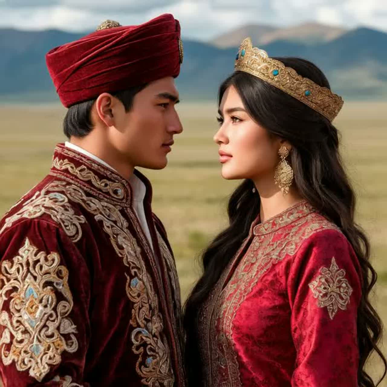 A brief guitar-driven intro opens into dynamic rock instrumentation: crunchy electric guitars, punchy drums, and subtle bass lines build intensity through the verses, The chorus expands with layered harmonies and driving rhythm, peaking before a stripped-down, introspective bridge, Kazakh national melodies, oriental wind instruments, The sound of the steppes, the whisper of the wind, a duet of low female vocals and velvety male vocals, Echoes in the passages, dombra