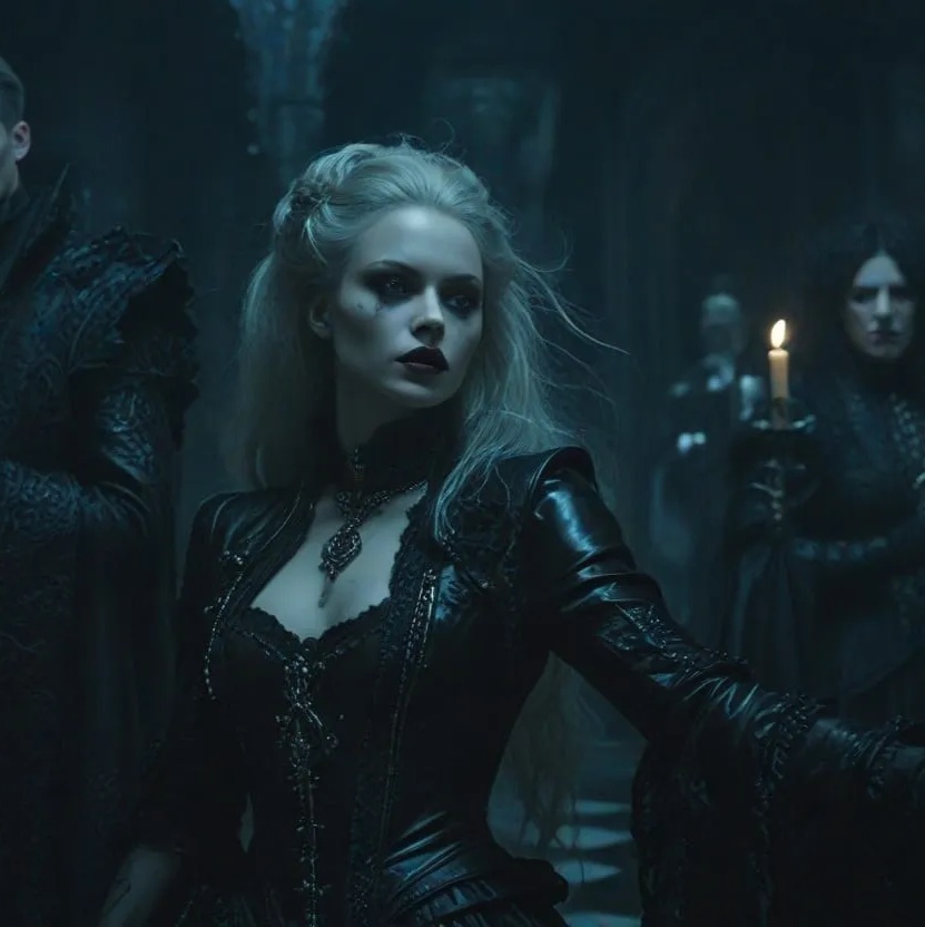 The song opens with pounding darkwave techno drums, pulsating bass, and ominous synth sequences, Distorted, reverb-heavy guitars weave with eerie atmospheric pads, Trance arpeggios push the ritualistic drive, while female vocals chant haunting Elvish, layered with breathy English whispers, The chorus surges with euphonic synths, industrial textures, and hypnotic melody, evoking an ecstatic, blood-soaked dancefloor inside a neon-lit cathedral, Each drop fuses intensity and beauty, haunting and euphoric, guitar electric, vibrant drops, and hypnotic riffs fill a Dolby Atmos mix, enveloping with eerie, seductive intensity, vampyric elvish ad-libs echo through reverb-drenched FX, heavy bass line, atmospheric textures, Atmospheres swell, layering gothic ambient textures and ritual trance synths for a hypnotic build, exploding into an ecstatic, primal chorus before dissolving into an immersive, textured outro, vocal chop, deep house techno, reverb/delay, dark electronic, effects, glass