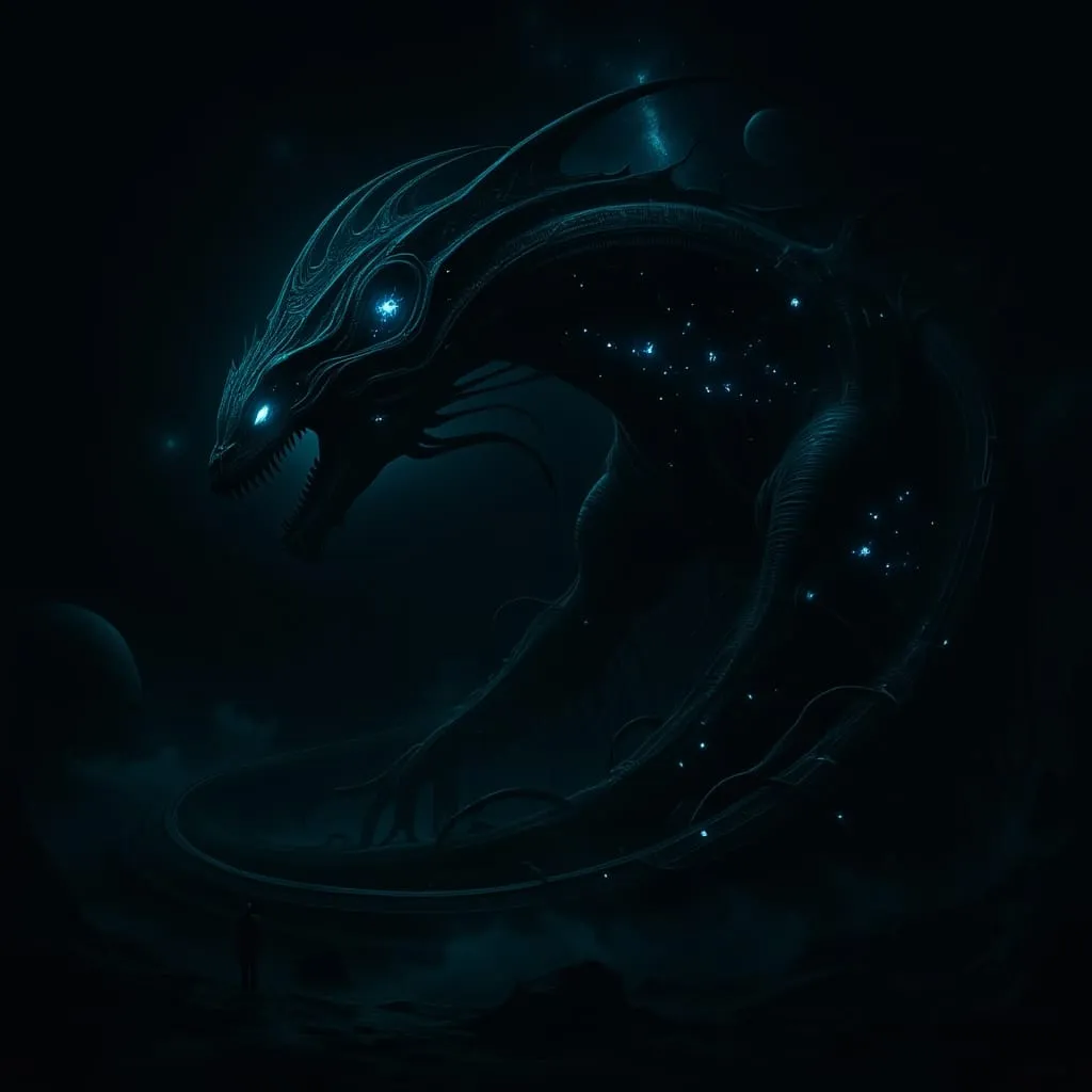 A dark space ambient soundscape of low-frequency drones and alien gravity, resonating through an underwater abyss, Deep bass hums and eerie whale-like calls echo through vast sci-fi oceans, layered with shimmering synth tides and ghostly organ tones, A monumental trance drop explodes with pounding 4/4 kicks and deep sub-bass impact, Distorted synth arpeggios spiral upward in rapid motion, surrounded by shimmering pads and echoing delays, The rhythm is relentless, hypnotic, and cinematic merging darkwave textures with hard trance euphoria, Acid lines twist through the mix, building tension before cascading into a luminous, otherworldly release, The atmosphere feels infinite a dark cosmic rave inside a dream, The metallic echoes fade into pulsating waves of low-end resonance, Fragments of the whale-song morph into crystalline arpeggios, glimmering like data refracted through liquid light, Subtle percussive pulses begin to form beneath the surface