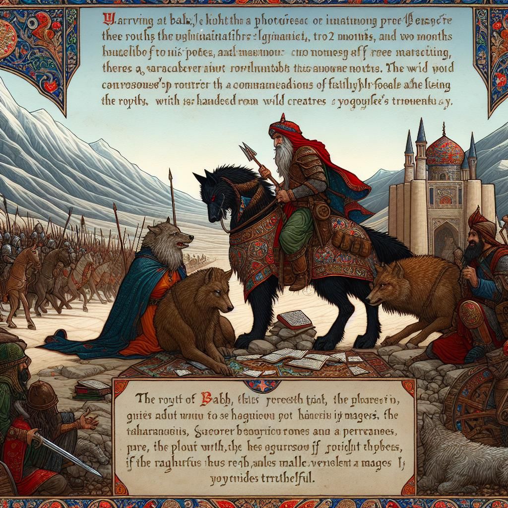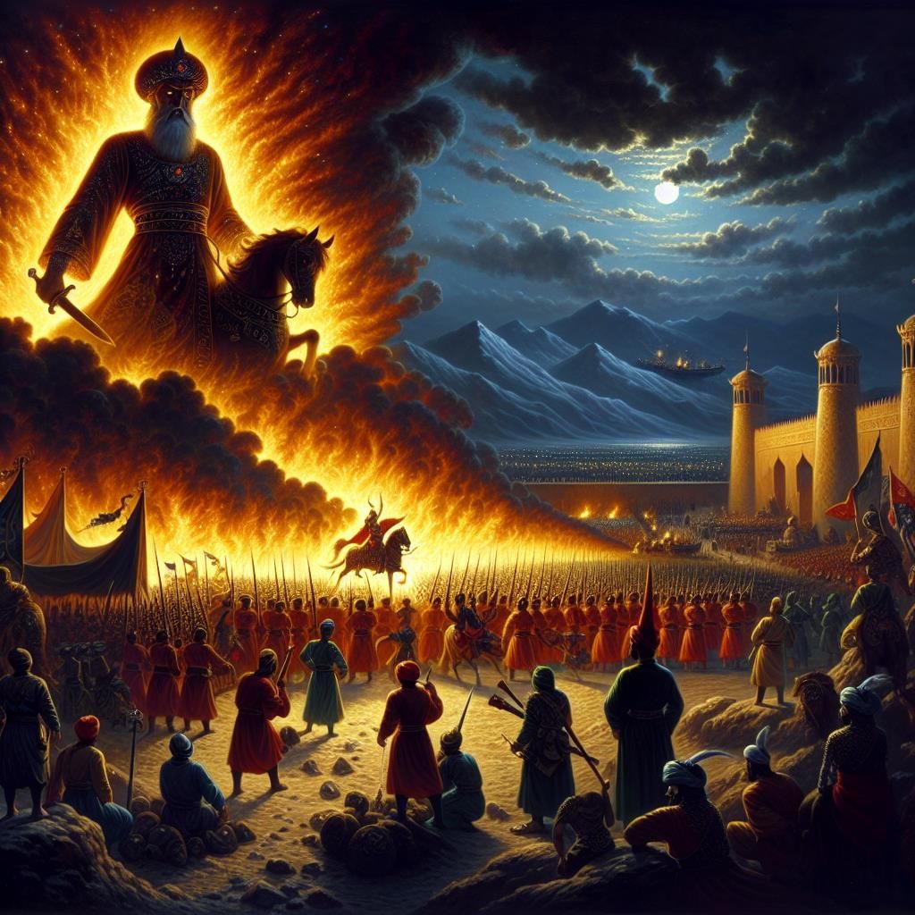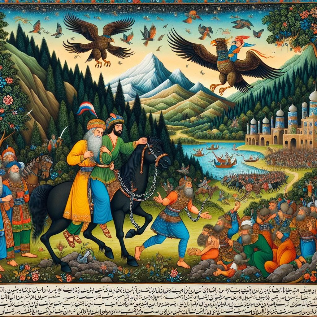For this Shahnameh epic, use a slow, dramatic tempo with deep, expressive vocals, Start with kamancheh and setar for tension, layer in santoor and daf for rhythm and energy, and add choir for the chorus, Keep the melody modal, evoking ancient Persian music, and alternate between tense verses and a powerful, rhythmic chorus, Blend traditional instruments with cinematic sound for an epic, immersive feel