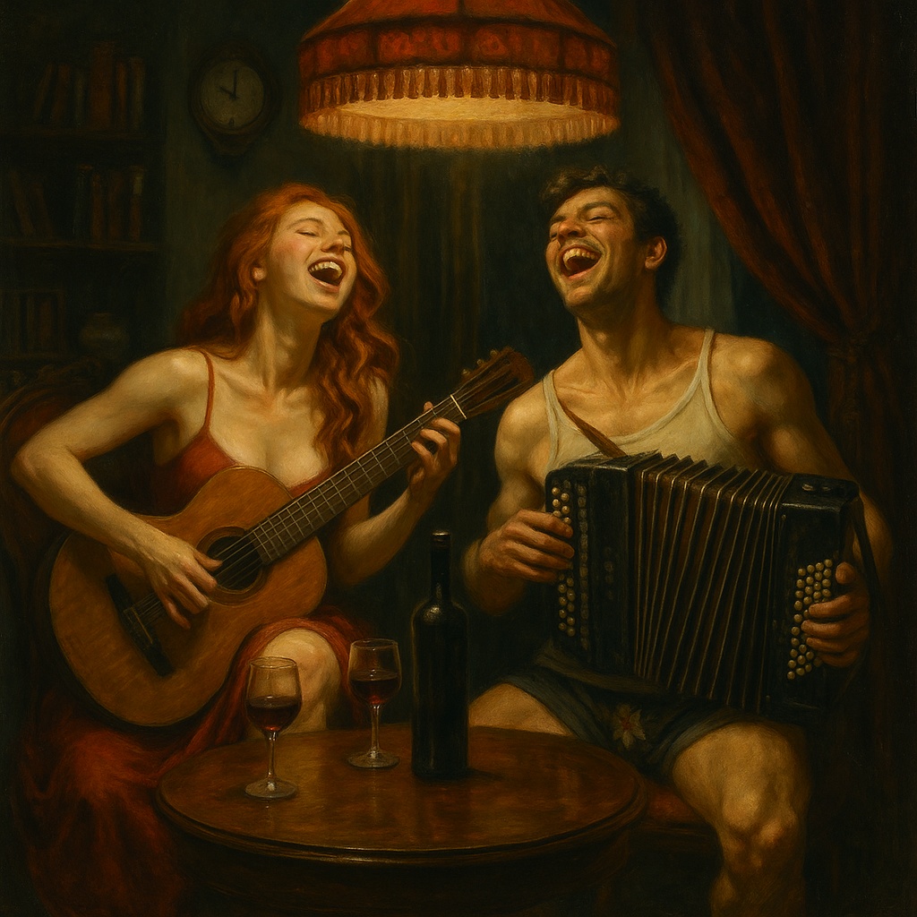 the song starts calmly, quietly, then the rhythm increases and in the end it becomes energetic, cheerful, danceable, minimal techno, klezmer, pirate folk, pirate song, bluegrass, violin, bonjo, accordion, male rough hoarse voice