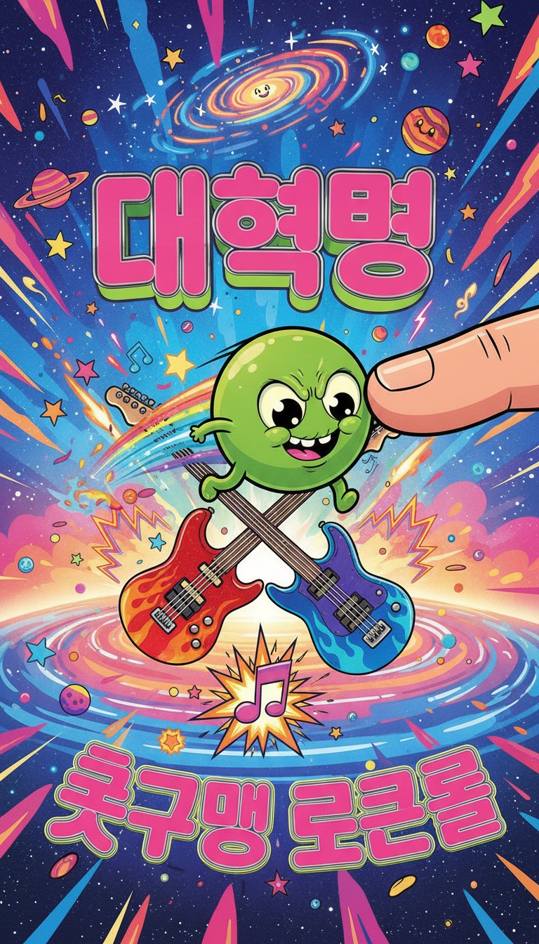 High-energy Korean rock; crunchy dual guitars over a clear, melodic bass line that drives the main riff, First two verses tight and punchy, third verse drops to half-time groove with tom-heavy drums, then guitar solo erupts, Last verse modulates up a whole step, lifting the vocal intensity, Male vocals with rowdy gang shouts on the hook, bright overdriven tone, and a flashy guitar solo trading with the bass in the bridge