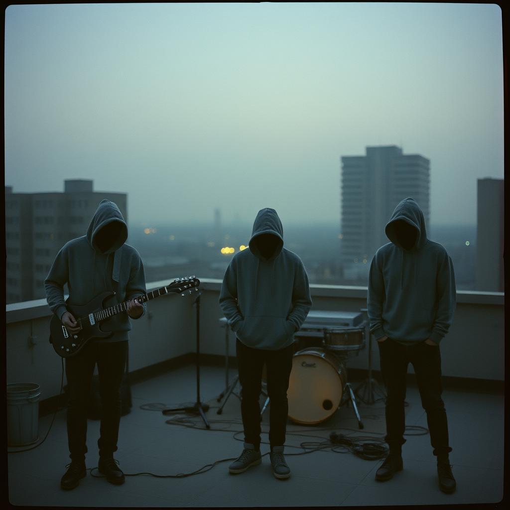 indie alternative, distorted jangly guitars, driving quarter-note kick drum, lo-fi room reverb, fuzzy bass, raw production with intentional noise, mid-tempo builds to chaotic chorus, shouted group vocal layers on chorus, dry deadpan lead vocal in verses, slightly unhinged energy throughout, melodic pre-chorus over sparse instrumentation, lyrical chant outro fading to tape noise, 130-145 BPM