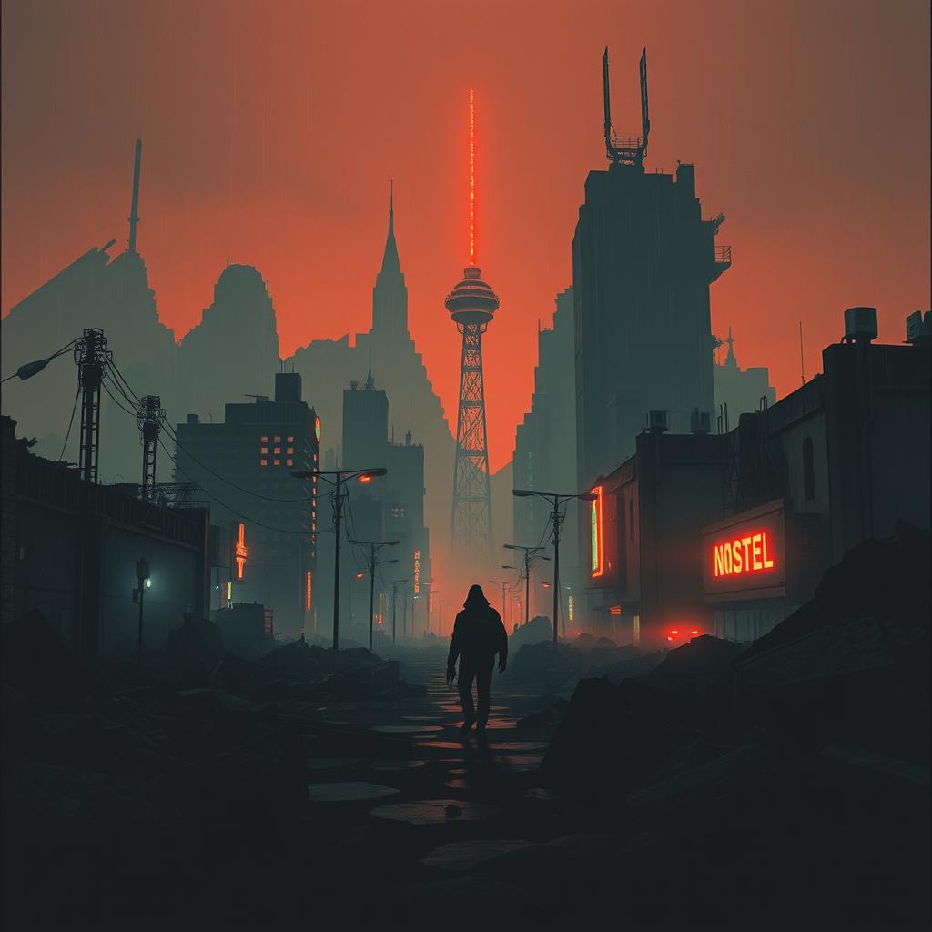 Post-apocalyptic dark synth, cinematic industrial ambient, 80s horror influence, desolate radioactive wasteland vibe, analog synthesizers, distorted drones, Distorted Guitar, Heavy Bass, slow rhythmic metallic percussion (with filters), eerie minor-key melody, John Carpenter style, tempo: 90-110 BPM