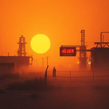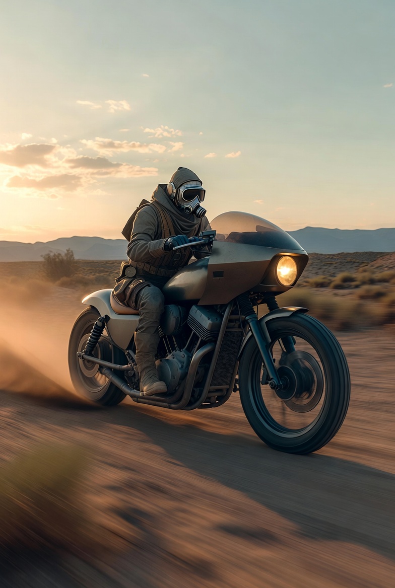 Post-apocalyptic dark synth, cinematic industrial ambient, 80s horror influence, hints of 80s Heavy Metal; gun combat action in a wasteland vibe, analog synthesizers, distorted drones, Distorted Guitar, slow rhythmic metallic percussion (with filters), eerie minor-key melody, John Carpenter style, tempo: 100-128 BPM