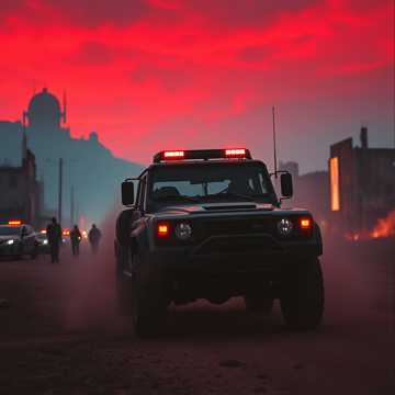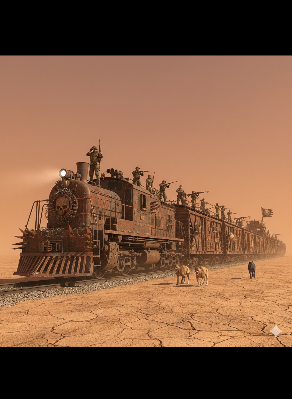 Post-apocalyptic dark synth, cinematic industrial ambient, 80s horror influence, hints of 80s Heavy Metal; gun combat action in a wasteland vibe, analog synthesizers, distorted drones, Distorted Guitar, slow rhythmic metallic percussion (with filters), eerie minor-key melody, John Carpenter style, tempo: 90-110 BPM, Anthem