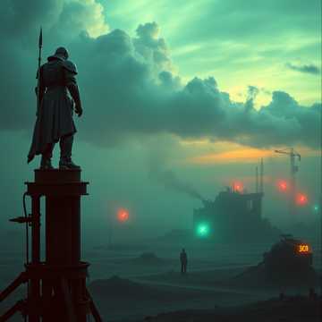 Dark Ambient, Post-Apocalyptic Industrial, 80s Dark Synthwave, 90s FPS OST, John Carpenter, Primeval style, Cinematic, Gritty, Slow-burn, 100 BPM, Minor Key, Gritty, Bass: Heavy, distorted analog synth bass, side-chained to kick, Lead: Haunting, minor-key synth melody, 80s cinematic style, Percussion: Slow, rhythmic metallic thuds, industrial heartbeat pulse