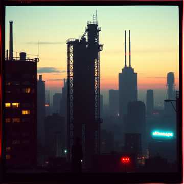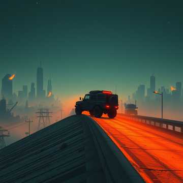 Post-apocalyptic dark synth, cinematic industrial ambient, 80s horror influence, hints of 80s Heavy Metal; gun combat action in a wasteland vibe, analog synthesizers, distorted drones, Distorted Guitar, slow rhythmic metallic percussion (with filters), eerie minor-key melody, John Carpenter style, tempo: 90-110 BPM