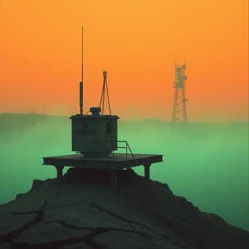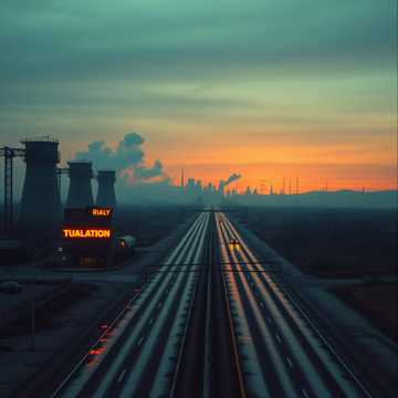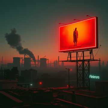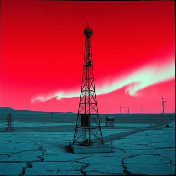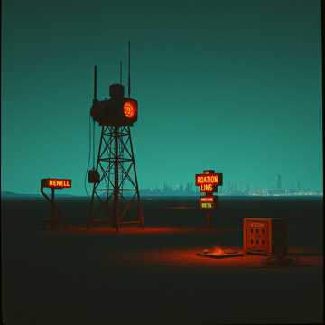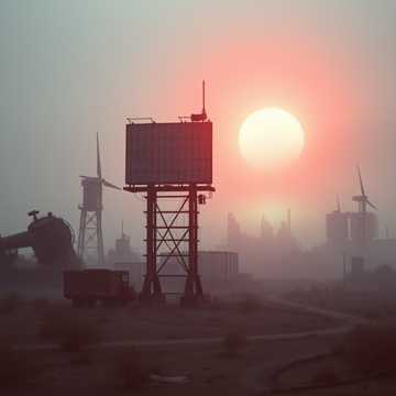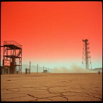 Post-apocalyptic dark synth, cinematic industrial ambient, 80s horror influence, desolate radioactive wasteland vibe, analog synthesizers, distorted drones, Distorted Guitar, slow rhythmic metallic percussion (with filters), eerie minor-key melody, John Carpenter style, tempo: 90-110 BPM