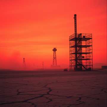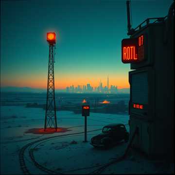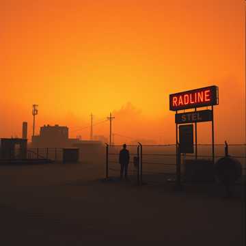 Post-apocalyptic dark synth, cinematic industrial ambient, 80s horror influence, desolate radioactive wasteland vibe, analog synthesizers, distorted drones, slow rhythmic metallic percussion, eerie minor-key melody, John Carpenter style, tempo: 90-110 BPM