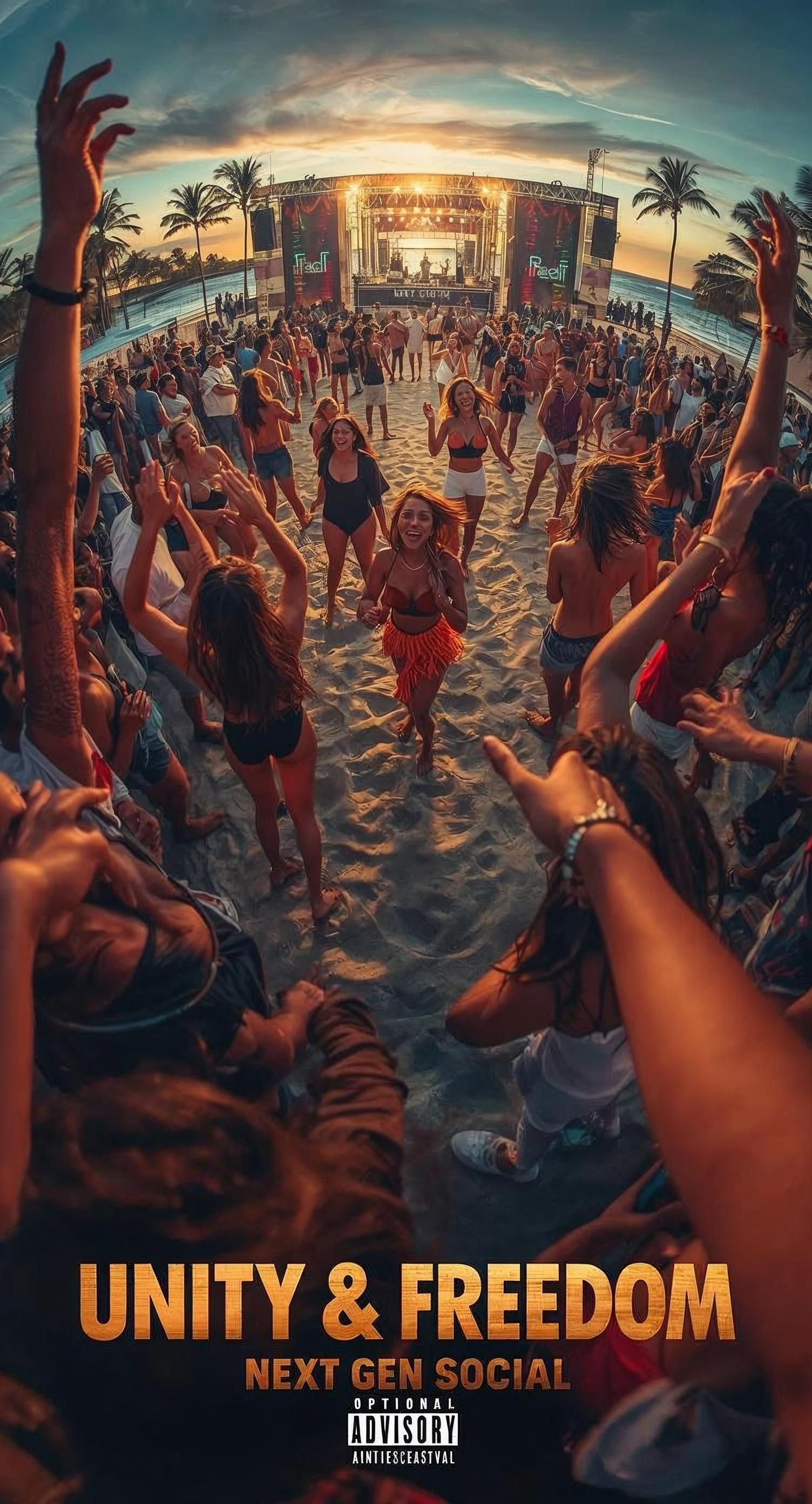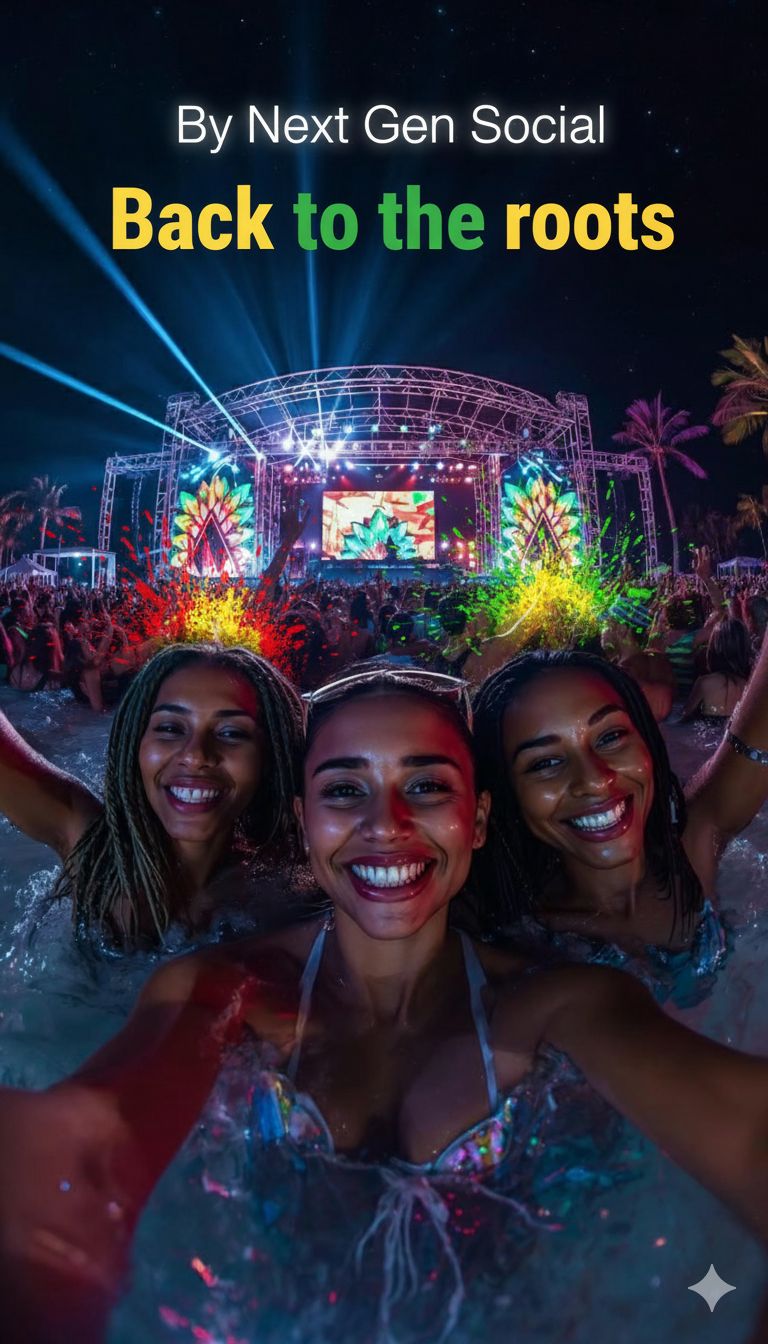 Create a vibrant Reggae × Dancehall × Soca track called "Unity & Freedom" by Next Gen Social, Tempo: ~102 BPM, tropical, festival-ready energy, Male and female Caribbean vocals chanting about unity, love, and freedom, Catchy chorus with call-and-response ad-libs ("Yeah!", "One love!"), Instruments: steel drums, warm bass, congas, percussive fills, subtle synth pads, FX & tricks: reverb/delay on leads, risers before chorus, echoed snaps/claps, beat punches, stereo panning for ad-libs, ambient island sounds (waves, festival crowd), Mood: uplifting, inclusive, tropical festival vibe, Sections: