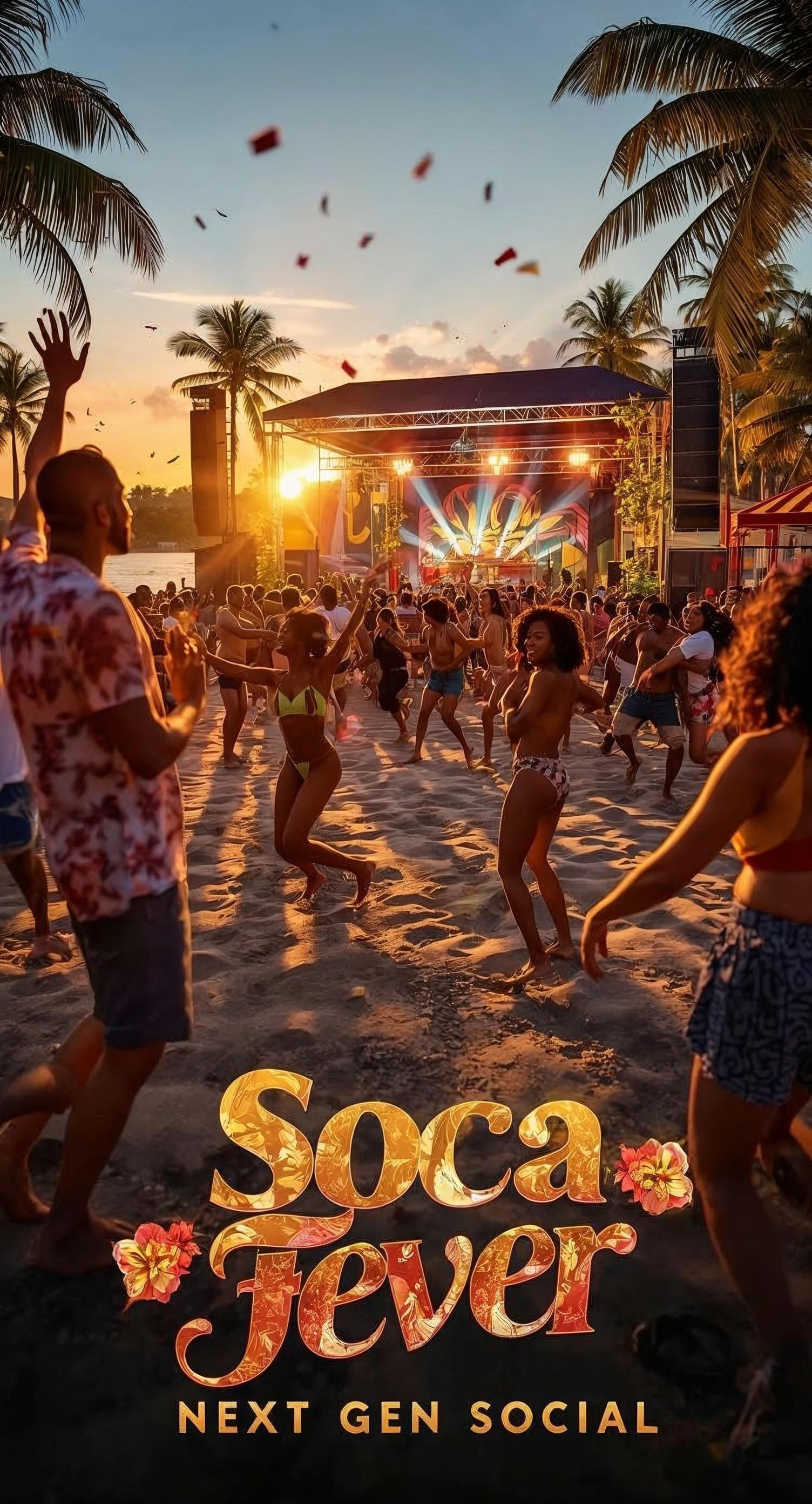 1, Intro: reggae chords, warm sunset vibe, 2, Verse: dancehall groove, vocal attitude, 3, Chorus: soca energy, festival hook, full instrumentation, 4, Bridge: tropical build-up with subtle ad-libs, 5, Outro: fade-out with reggae bass, echoed crowd chants, Keywords: Caribbean, tropical vibes, festival, reggae, dancehall, soca, island energy, unity, Tone: lively, warm, inspiring