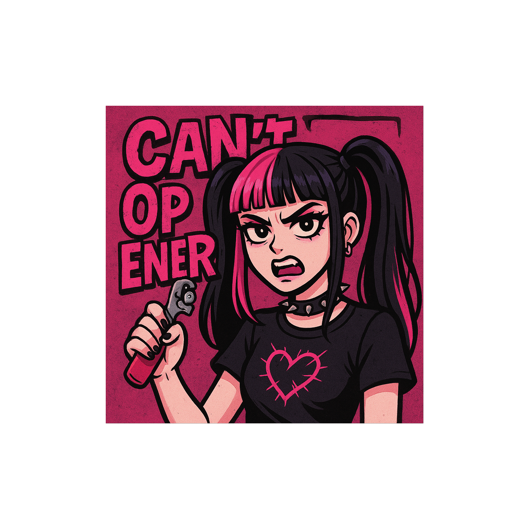 A brat-vibe egirl hyperpop / alt-punk song called “CAN’T OPENER, ” Fast, punchy, dramatic vocals with sass and humor, Starts with a deadpan intro (“I’m no good at intros, so let’s just get into it”), then launches into a distorted cyberpunk beat mixed with crunchy pop-rock guitars, Lyrics are playful and chaotic about yelling at a can opener that can’t open bottles — turning domestic frustration into an anthem, Add glitchy transitions, over-the-top vocal layers, and a breakdown with shouted “CANT OPENER!” screams before the final chorus, Energetic, brat-vibe, fun, and unhinged