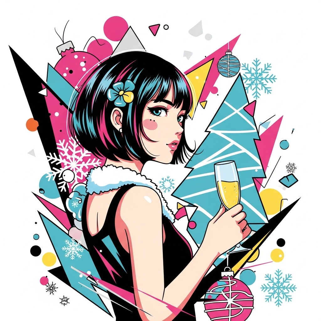 High-Tempo Hybrid Beat, Dance-Oriented Groove, Punchy Electronic Drums, Bouncy Bassline, Bright but Cold Synth Lead, Rhythmic Stab Synths, Minimal Christmas Bell Texture, Stylish Holiday Accent, Anime-Style Energy, Festival-Ready Arrangement, Tempo Around 180 BPM
