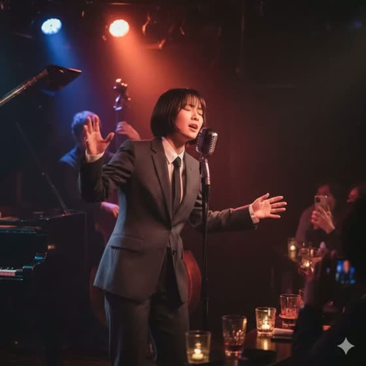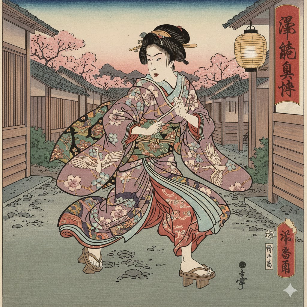 A cute female vocalist singing in soft Kyoto dialect, blending a charming kawaii tone with light and elegant city-jazz vibes, A lively fusion of modern jazz grooves with traditional Japanese instruments such as koto, shamisen, and wadaiko, Graceful, airy, slightly playful, and sweetly refined—an upbeat and stylish wa-inspired city jazz