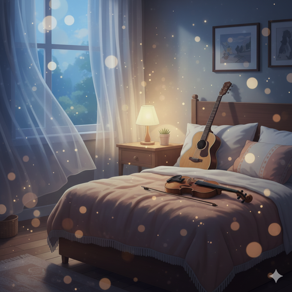 A cinematic Japanese-style lullaby titled Sea Cradle, Set on a seaside before dawn โ the sky fading from deep blue to pale light, Gentle piano leads the melody, with soft music-box echoes and distant strings, Waves move slowly, the breeze carries faint chime sounds, and light glimmers like drifting memories, Tempo: ~68โ70 bpm, Key: A major (nostalgic and hopeful), Mood: Emotional, airy, healing โ like time pausing between night and morning, Instrumentation: Piano, music box, soft strings, ocean ambience, subtle wind chime, Atmosphere: Tender and cinematic, capturing the fleeting stillness where light and sea meet