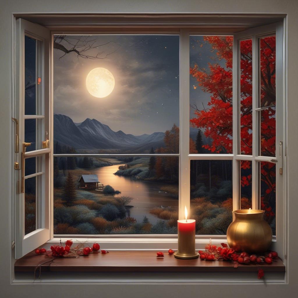 An autumn mountain landscape covered in red and gold leaves, A small log cabin stands quietly at the foot of the mountain, Through the window, two silhouettes gaze up at the full Supermoon, bathed in soft silver light and peaceful silence, Musical Style:
