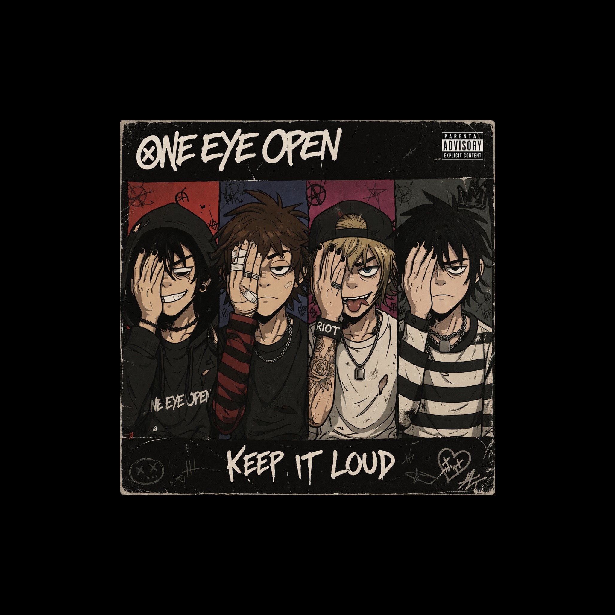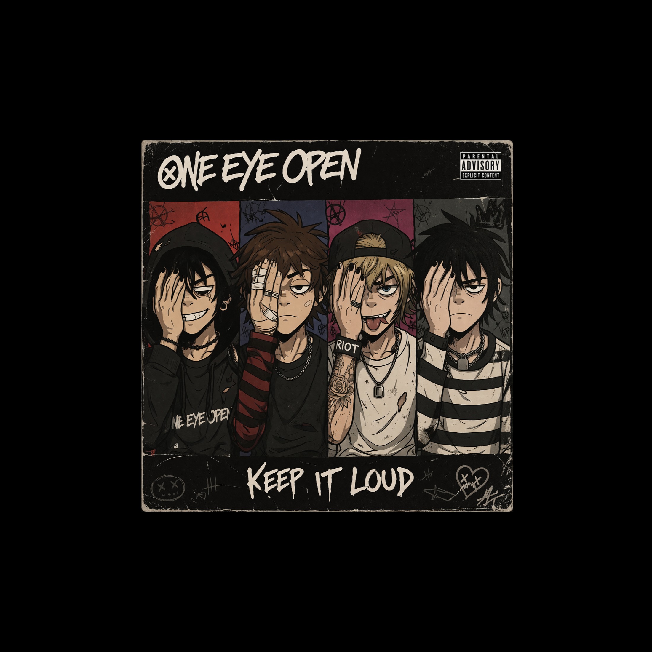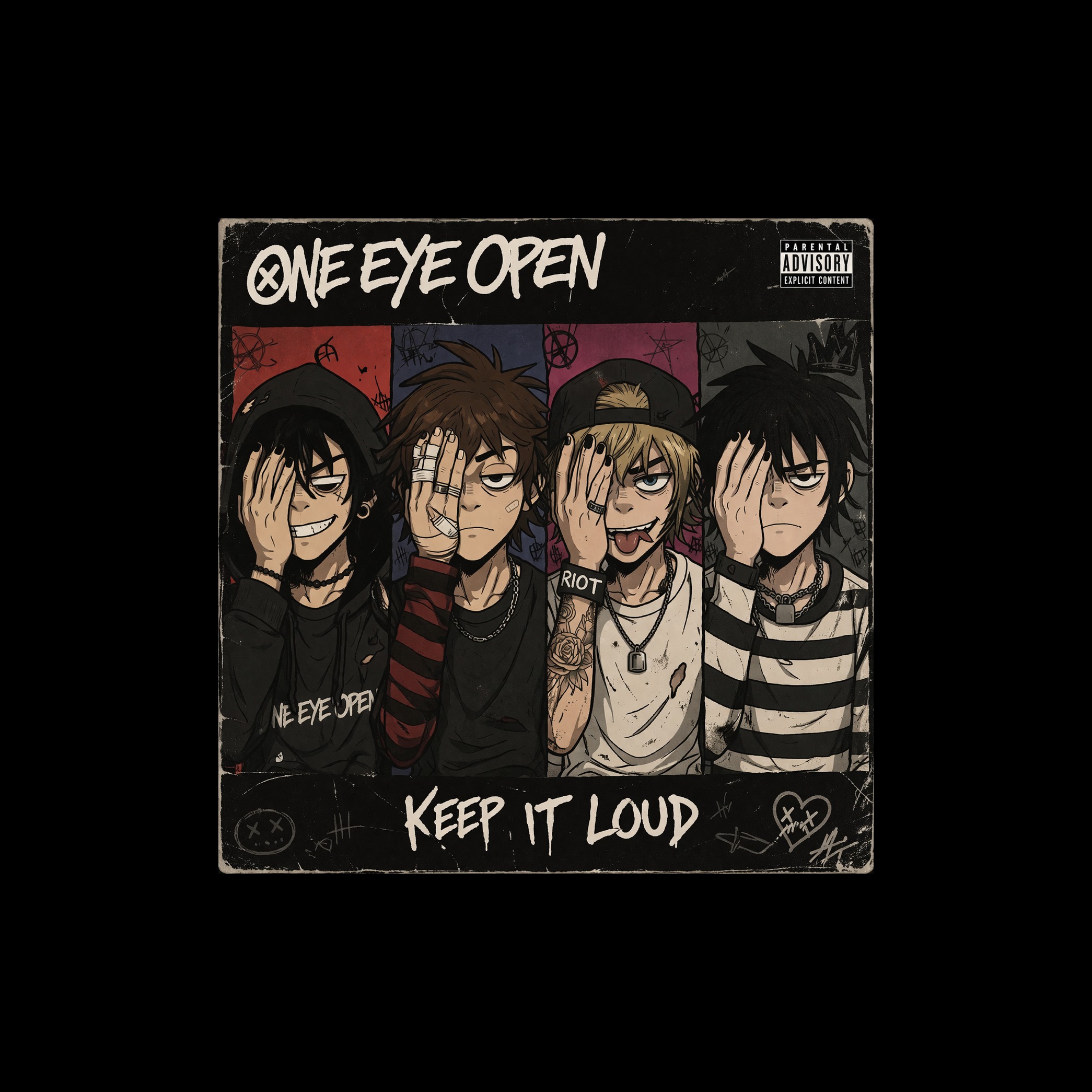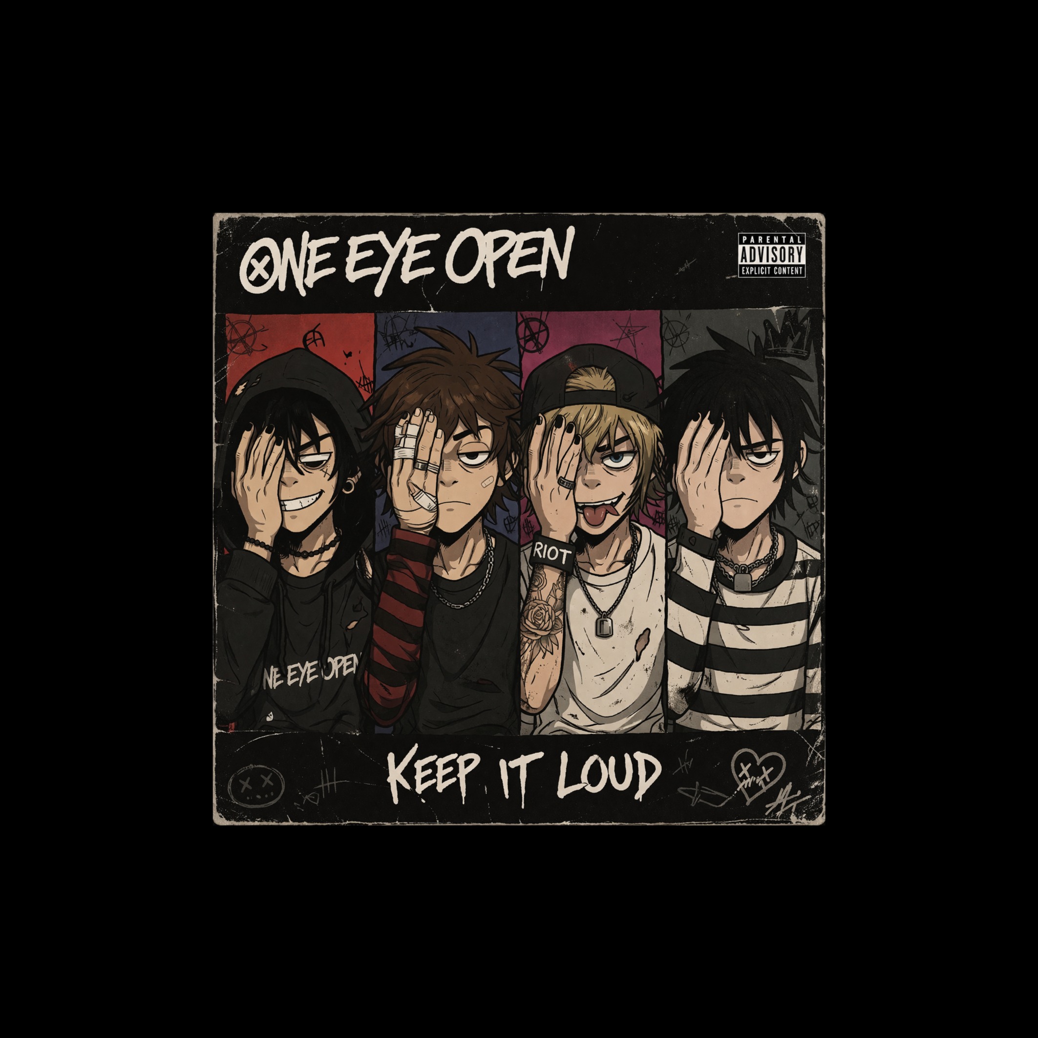 Post-Hardcore x Alt Rock x Emo Rock x Garage Rock x Nu Metal x Screamo X PUNK, Fast tempo, high-energy, riff-driven track, Heavy distorted electric guitar with fast palm-muted power chords and aggressive lead lines, Deep bass locked tightly with kick drum, Hard-hitting drums with strong kick/snare emphasis, driving relentless rhythm, Minimal chord progression, focused on powerful repeating riff, Youthful male vocal with raw aggressive delivery, mix of shouted, screamed, and melodic lines, Intense background vocals and ad-libs (“RIOT”, “LET’S GO”, “HEY”) placed rhythmically for hype, No crowd noise, Theme: rebellion, chaos, uprising, purge-like energy, Breakdown sections for moshpit, Amazing production sound and mixing — loud, punchy, clear, aggressive with garage grit and explosive dynamics