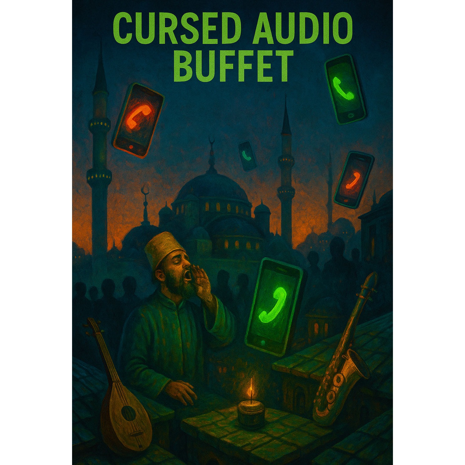 Sufi Trance+Microtonal Jazz+Phone Sample Collage; Sum: rooftop prayers clash with ringtones into skyline static; Emo: surreal, spiritual, chaotic; Vox: male chant→soft verse→falsetto→belt with crowd overlays, Turkish/Arabic hooks; Groove: trance hand-drum loop with syncopated jazz bass, rap-cadence break; Bass: modal root pedal, sync drone with static; Hook: “Allahu akbar, telefon çalar” ≤8w, repeat×2, callback; Pal: oud licks, ney flute, microtonal sax, muezzin sample-FX, ringtone beeps; Energy: 35→55→75→90→20; FX: phone buzz, call drops, pigeon wings; [Sound: layered wide rooftop]; [Freq: smooth 2–4k prayer calls, anchor lows 80Hz]; [Refine: wide reverb on chant, dry on rap verse]; [0:00–0:30 Opening][0:30–1:15 V1][1:15–1:40 Hook][1:40–2:10 Break][2:10–2:45 V2][2:45–3:20 Bridge][3:20–3:55 Final Chorus][3:55–4:15 Outro]; Mix: trance groove, jazz solo inserts, ringtone FX; Intent: spiritual devotion colliding with digital noise above Istanbul skyline, ‑Country; Folk; Reggae; Acoustic Pop; Opera Aria; Free Jazz; Lo-fi Plod; AI Choir Vowel Gibberish; Harsh Wall Noise; Mumbling