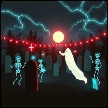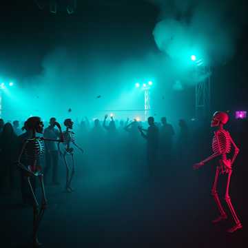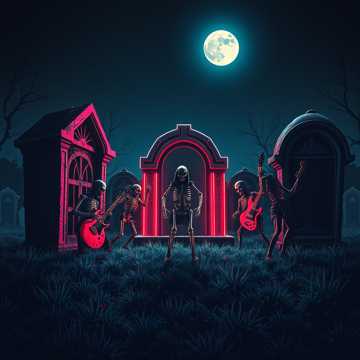 High‑energy undead party anthem with upbeat dance rhythms and distortion background guitars, deep bass guitar, bright playful synths, and cheerful melodies twisted by eerie choirs and ghostly whispers, Fun and uplifting but with a chilling supernatural edge, Bone‑rattling percussion, reverb‑heavy bells, and dramatic ‘wow’‑style drops, Raspy voice singer, Feels like a neon graveyard festival where skeletons dance and spirits celebrate, dark black metal male voice