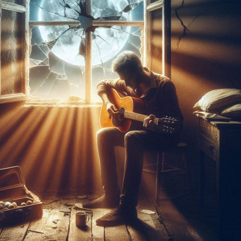 A slow, melancholic folk-rock ballad unfolds with a warm, resonant 12-string acoustic guitar carrying gentle fingerpicking and airy strums, Subtle ambient pads support the soundscape, while expressive, husky male vocals drip with spacious reverb, deepening the late-night atmosphere